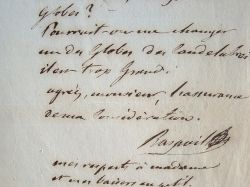 Raspail adresse son règlement pour l'acquisition d'une lampe. "Faut-il un globe à la lampe suspendue, car vous m'avez envoyé trois globes? Pourrait-on me changer un des globes des candélabres? Il est trop grand [...]".