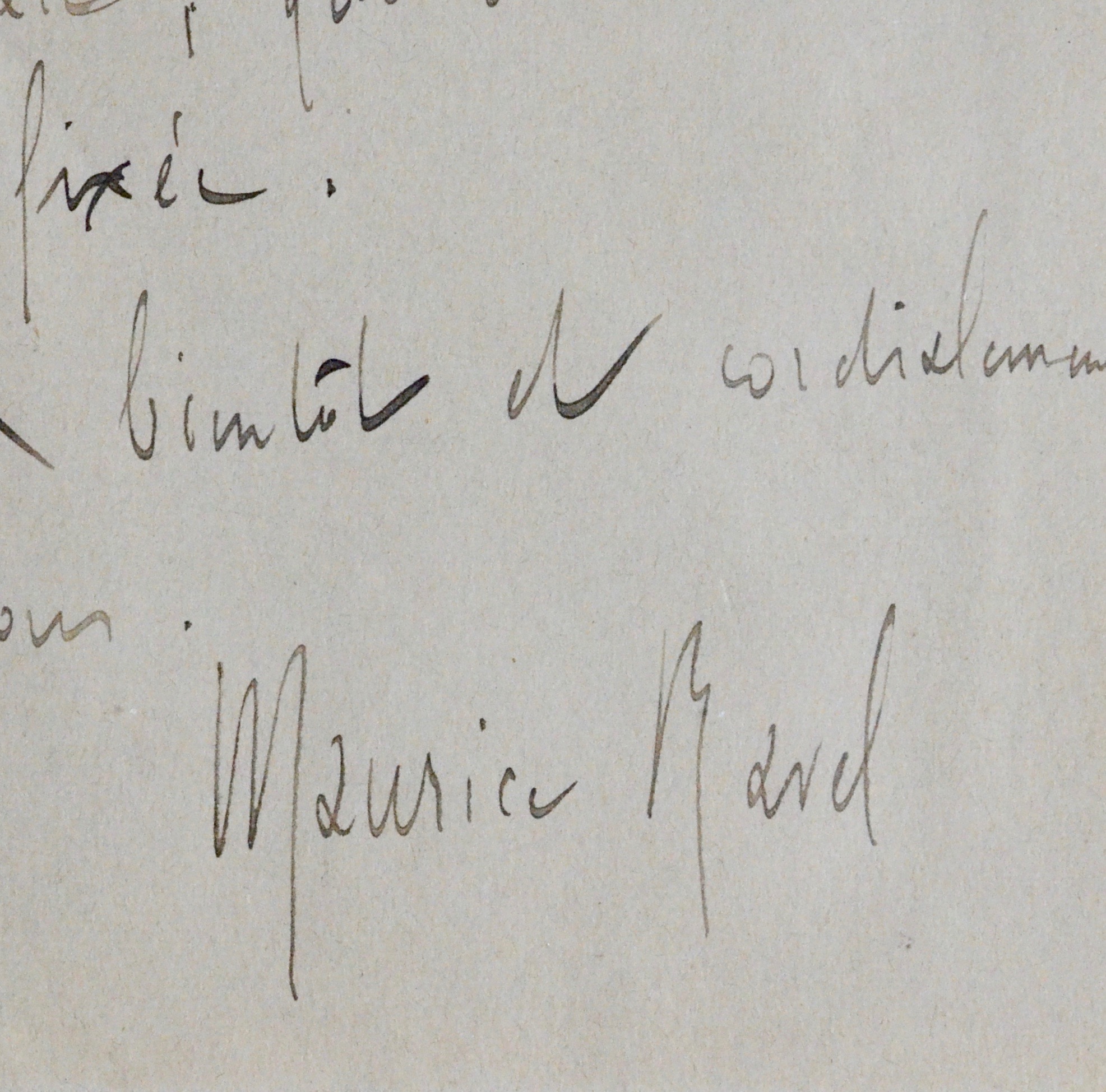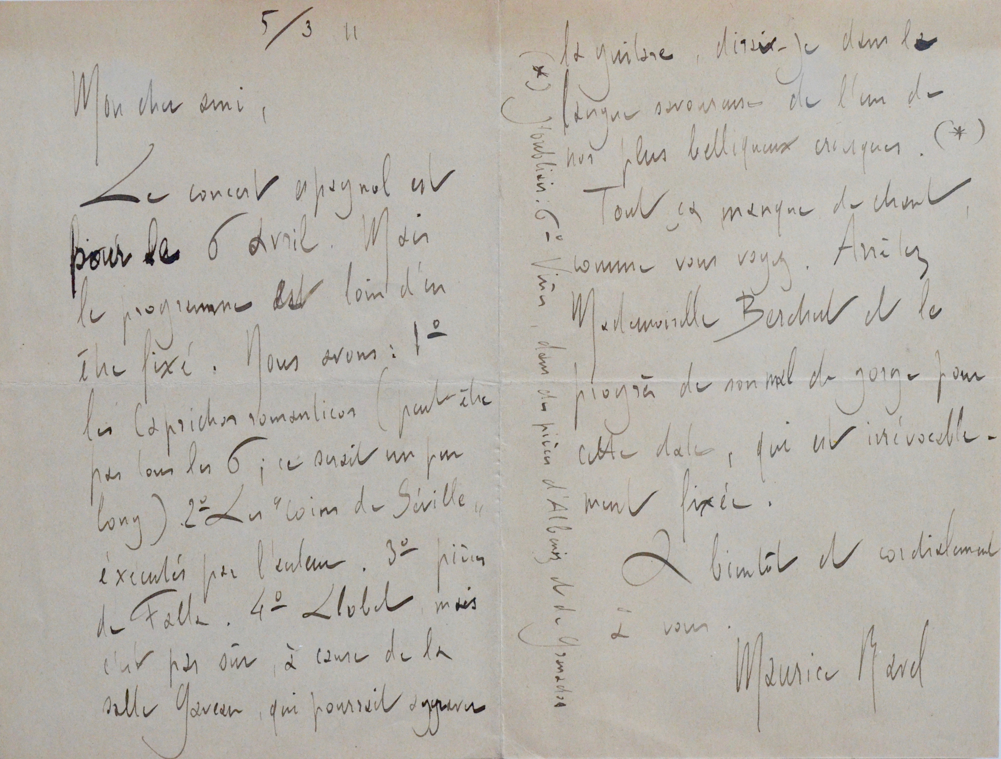 Maurice Ravel (Ciboure, 1875/1937)Belle lettre musicale de Maurice Ravel, à propos d'un concert espagnol prévu le 6 avril à la salle Gaveau, où doivent être jouées des oeuvres de Del Campo, Falla, Turina, Miguel Llobet, Albéniz et Granados.