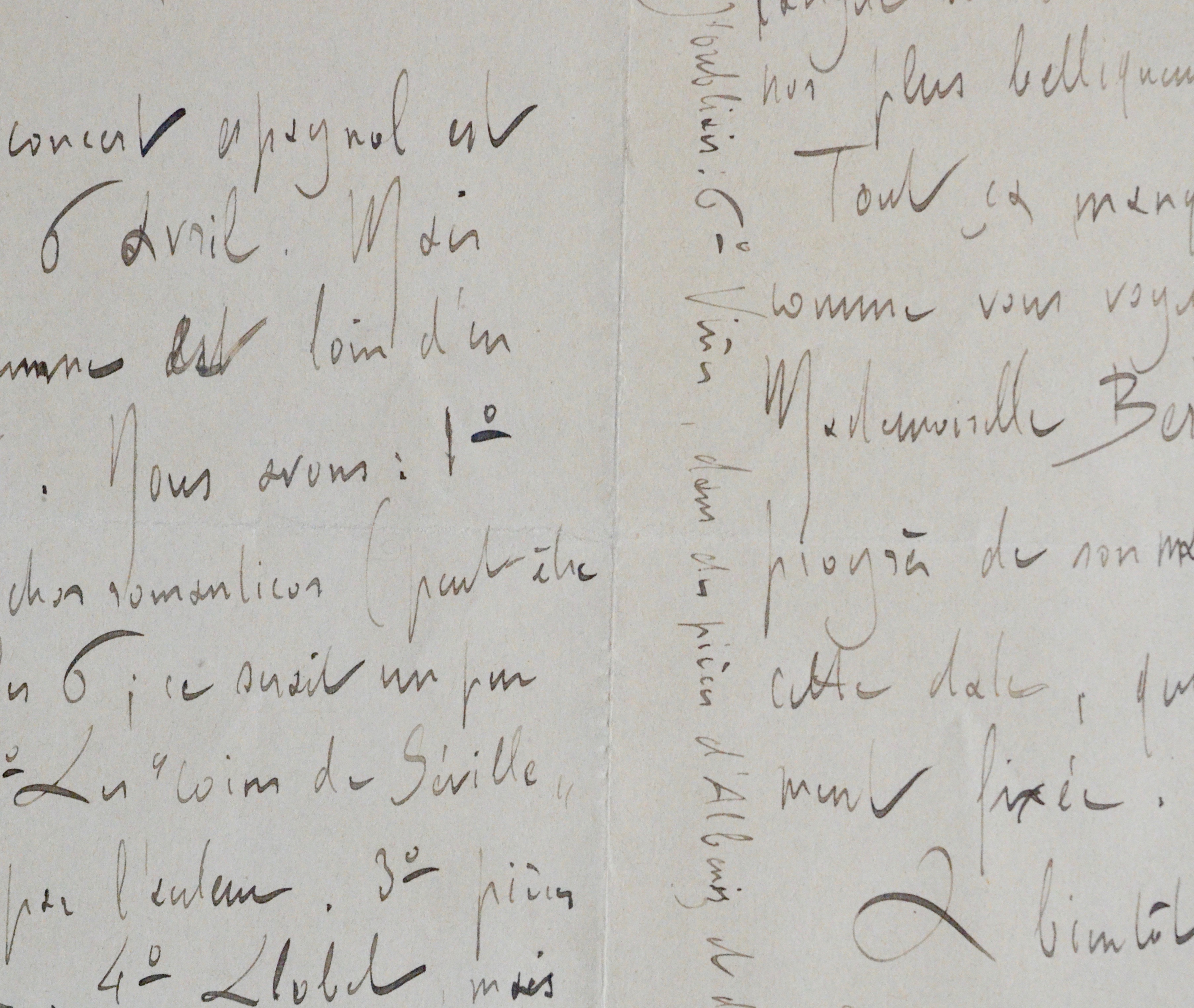 "Le concert espagnol est pour le 6 avril. Mais le programme est loin d'être fixé. Nous avons : 1° les Caprichos romanticos [de Conrado Del Campo, jouée par le quatuor Wuillaume] (peut-être pas tous les 6 ; ce serait un peu long). 2° Les "coins de Séville" exécutés par l'auteur [Joaquin Turina]. 3° pièces de Falla [Pièces espagnoles, qui furent jouées par Falla lui-même]. 4° Llobet, mais c'est pas sûr, à cause de la salle Gaveau, qui pourrait aggraver la guitare, dirais-je dans la langue savoureuse de l'un de nos plus belliqueux critiques. * J'oubliais : 6° Viñes, dans des pièces d'Albéniz et de Granados. Tout ça manque de chant comme vous voyez. Arrêtez Mademoiselle Berchut [la cantatrice Suzanne Berchut, dite Suzanne Balguerie (et le progrès de son mal de gorge pour cette date, qui est irrévocablement fixée [...]".