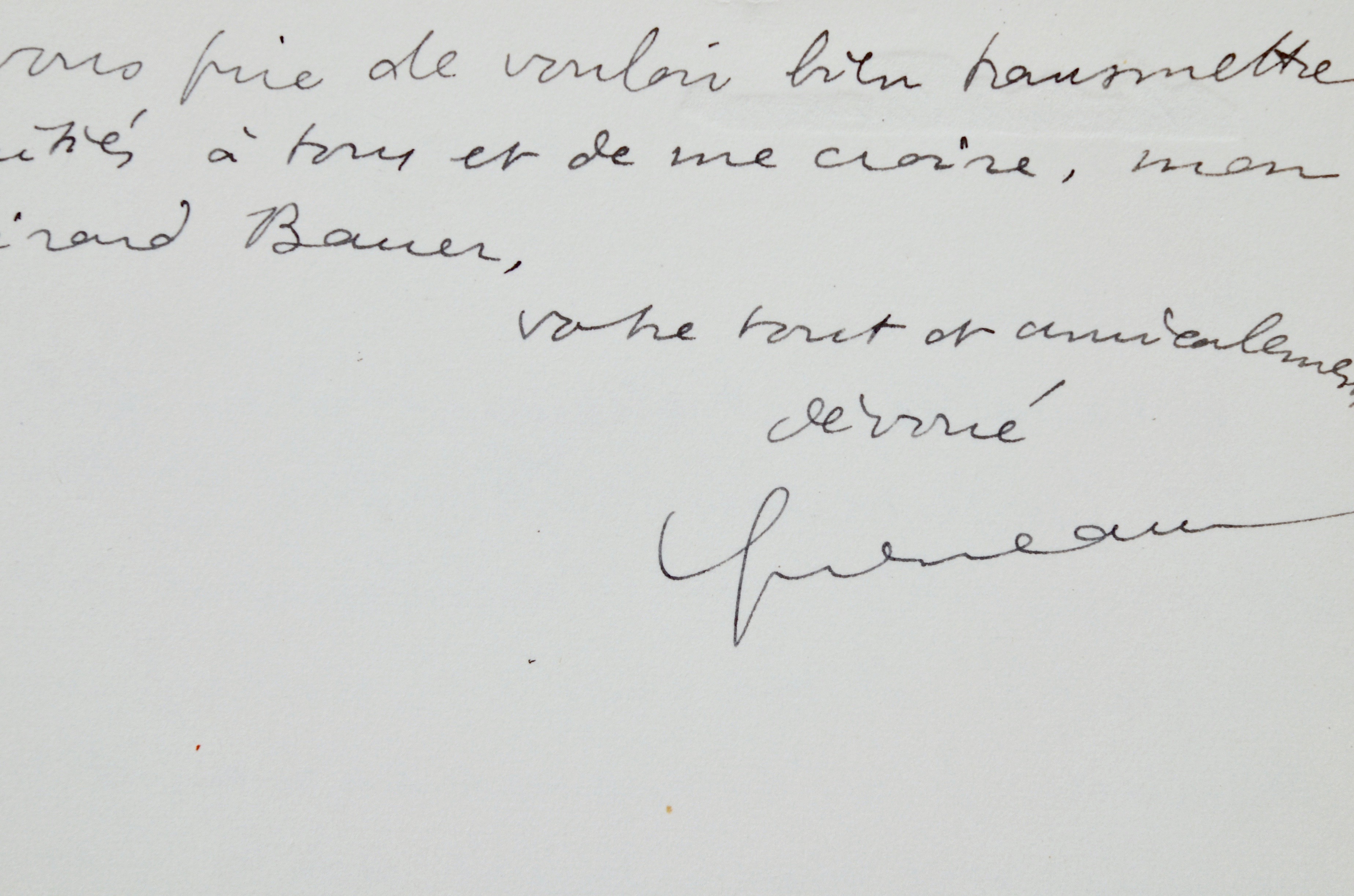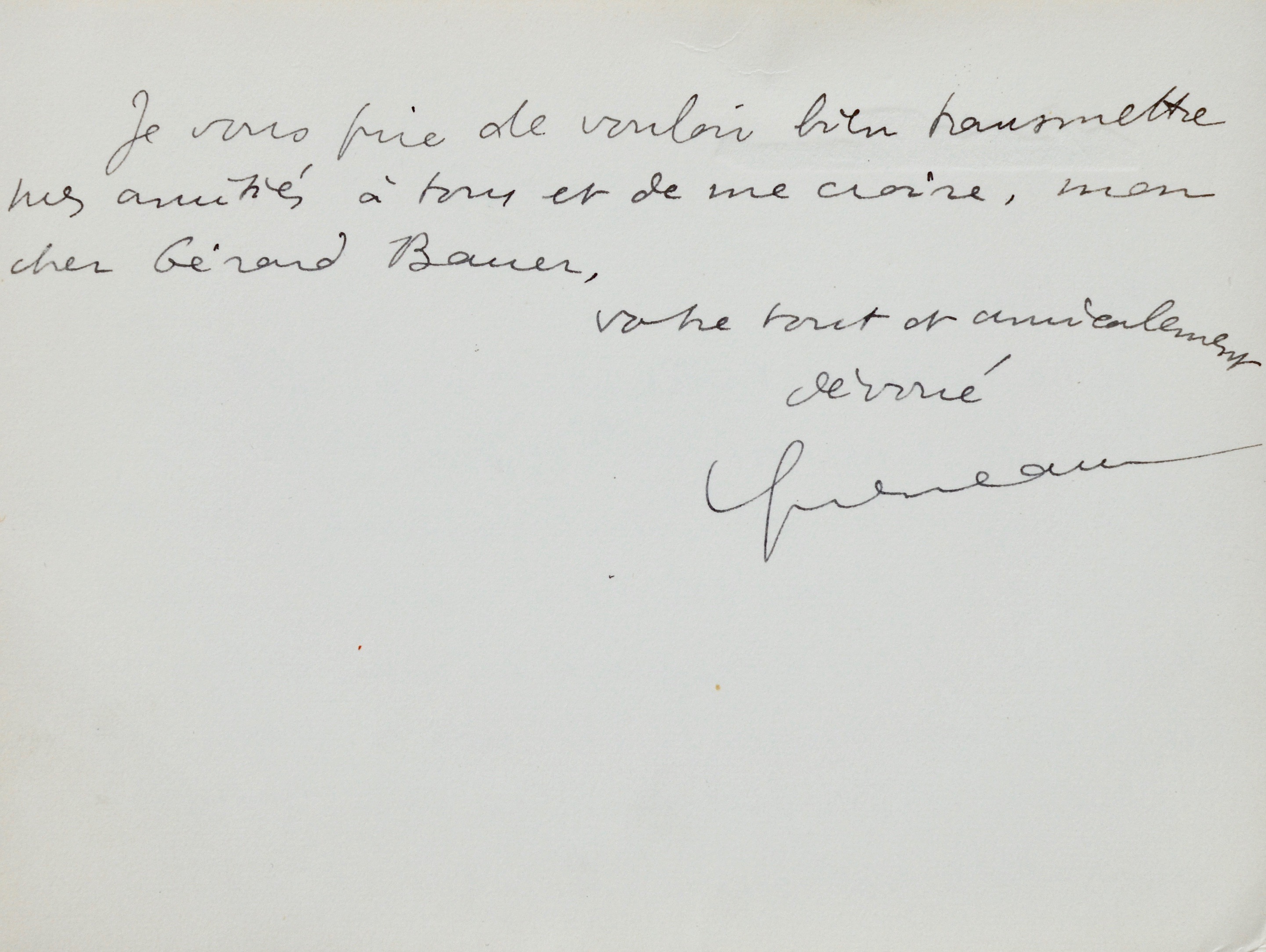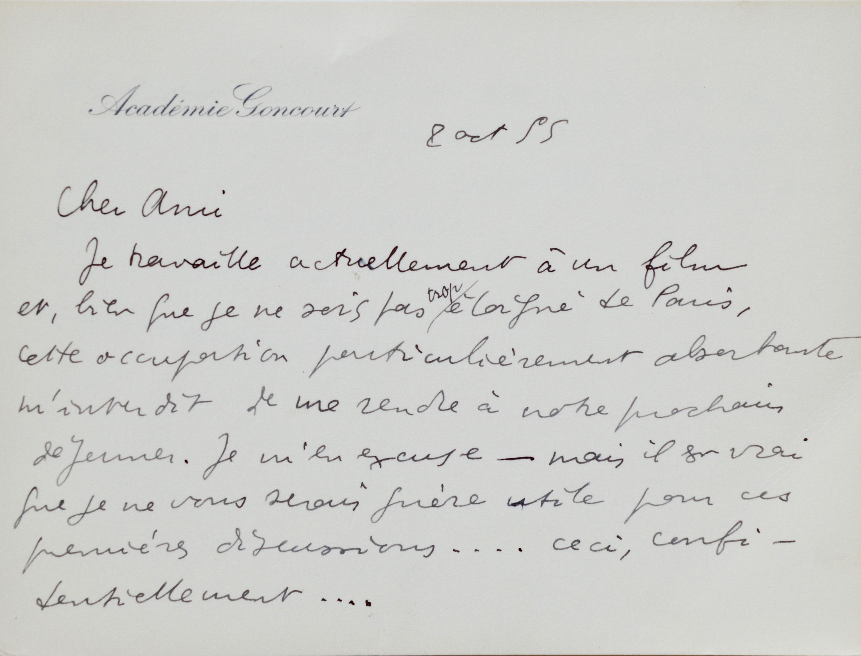"Je travaille actuellement à un film et, bien que je ne sois pas trop éloigné de Paris, cette occupation particulièrement absorbante m'interdit de me rendre à notre prochain déjeuner [avec les autres membres de l'Académie Goncourt]. Je m'en excuse - mais il est vrai que je ne vous serais guère utile pour ces premières discussions.... ceci, confidentiellement.... Je vous prie de vouloir bien transmettre mes amitiés à tous et de me croire, mon cher Gérard Bauer votre tout et amicalement dévoué".