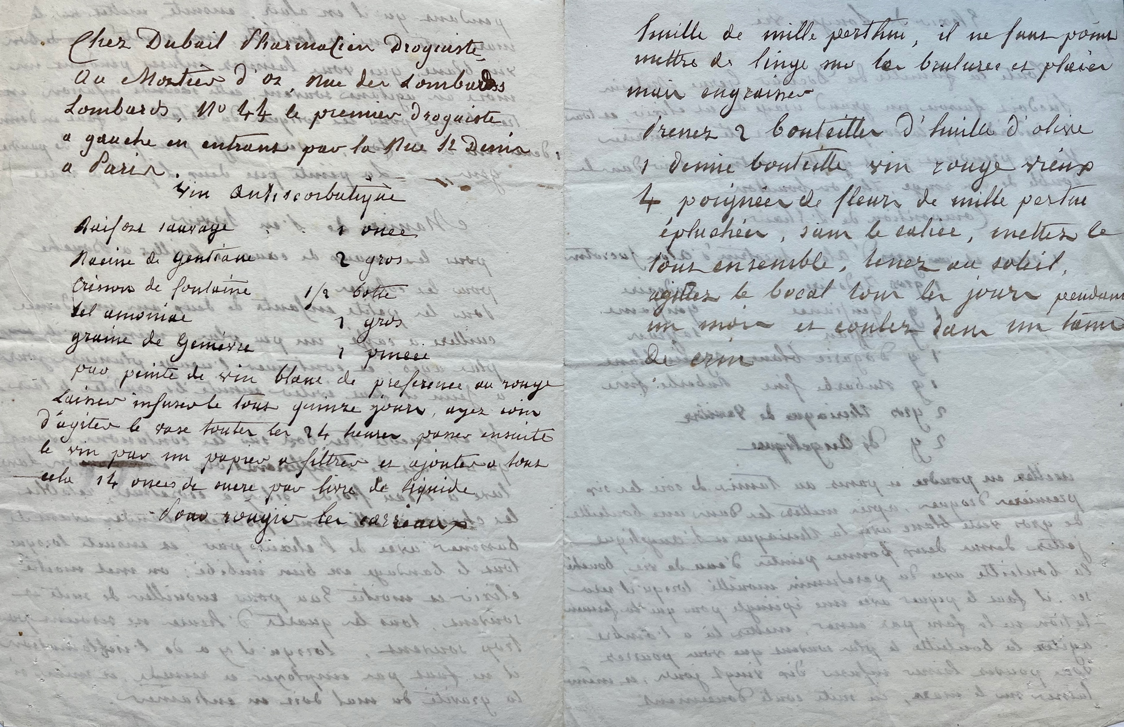 Vient ensuite la "Manière de s'en servir". Puis, à la suite, les coordonnées d'un pharmacien droguiste nommé Dubail, à Paris et, d'une autre main, la recette du vin antiscorbutique.