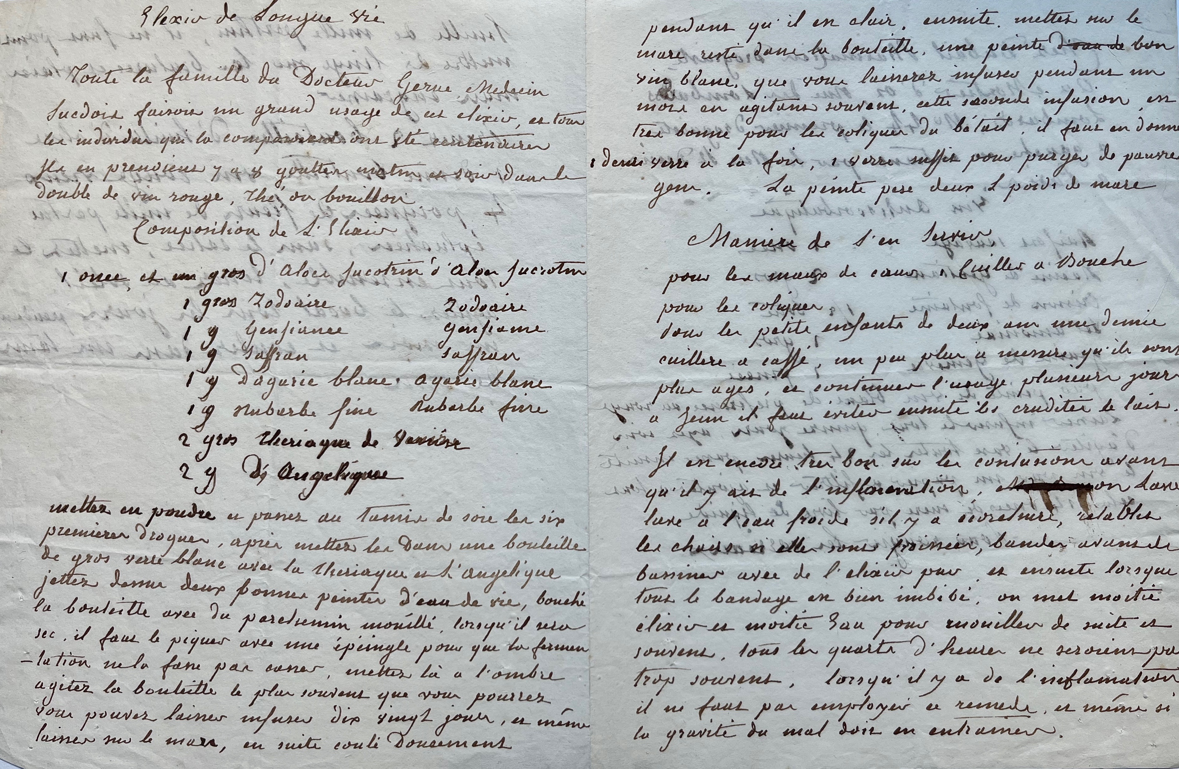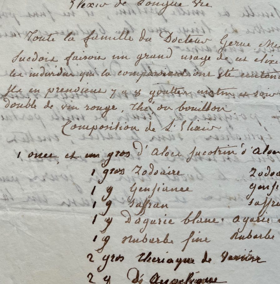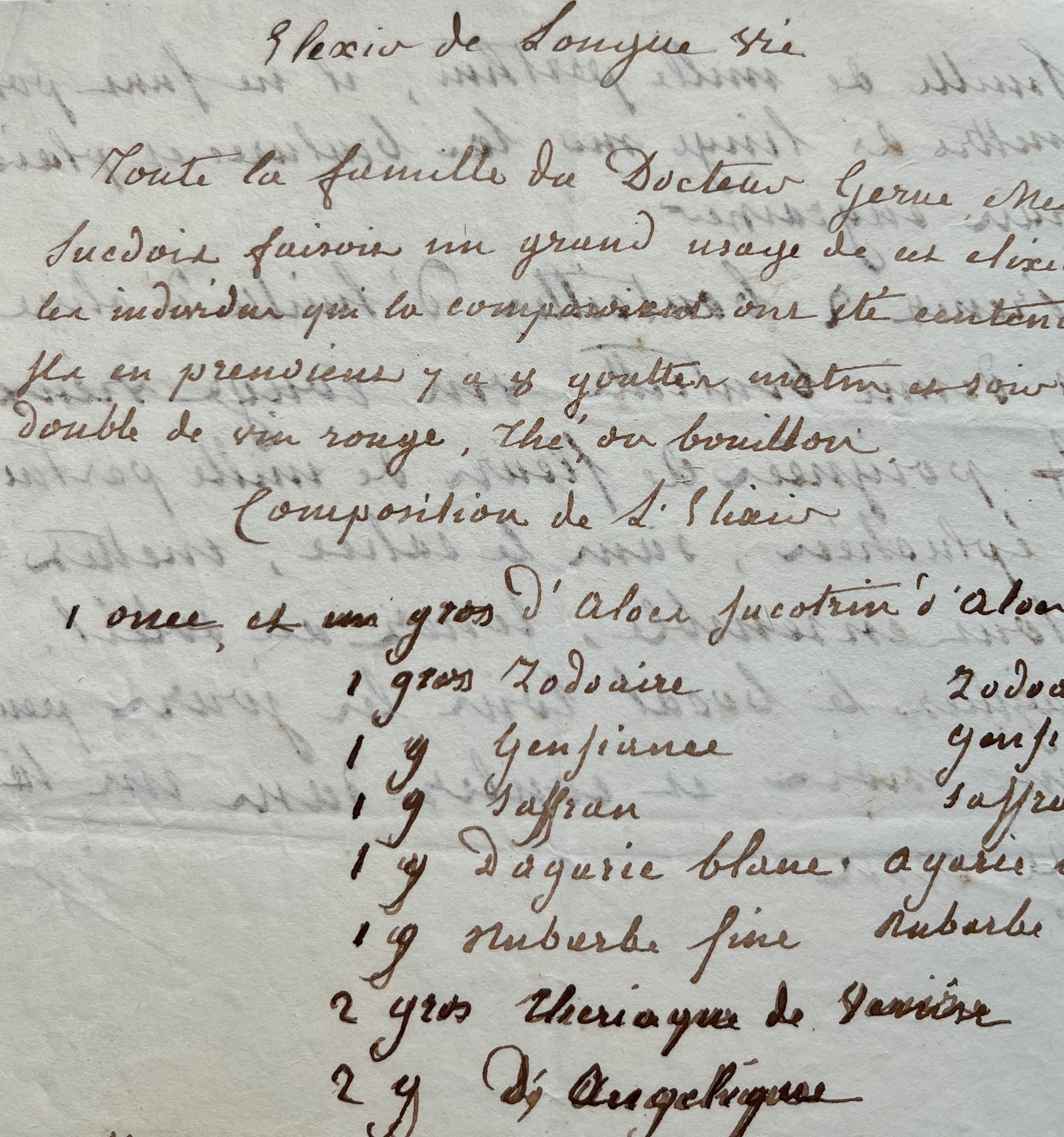 Recette manuscrite d’un « Elixir de longue vie » : ingrédients, préparation et usages