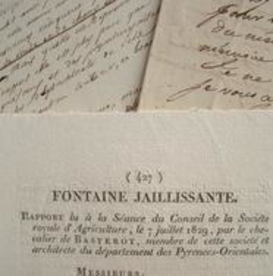 Petit dossier relatif à la recherche de "fontaines jaillissantes" dans la région de Perpignan. 1. Lettre du géologue Eugène Durand (2 pp. in-4, Perpignan), rapport sur différents sondages effectués sur la place de l'Esplanade de Perpignan, ainsi qu'à Bages et Rivesaltes. 2. du même, "Coupe géologique du 1er forage de M. E. Durand à Toulouges" (1 p. gd in-folio, Perpignan, 1835). 3. Imprimé : "Fontaine jaillissante. Rapport lu à la séance du Conseil de la Société royale d'Agriculture, le 7 juillet 1829, par le chevalier Basterot, membre de cette société et architecte du département des Pyrénées-Orientales" (7 pp. in-8). 4. Analyse des eaux de Bages et Rivesaltes, manuscrit signé "B." (sans doute Bouis, professeur de chimie, 2 pp. in-8 + annotations).