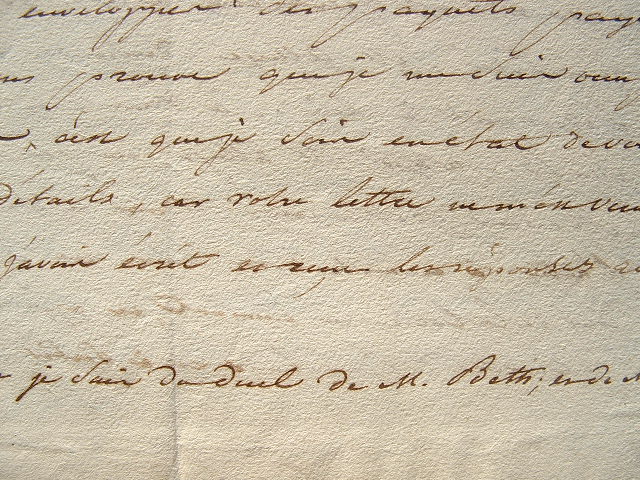 Lettre non identifiée donnant le récit d'un duel en Allemagne. Elle relate les circonstances de l'altercation au cours d'un dîner, entre M. Alloye et M. Bethermann, puis le duel lui-même. «Le lendemain, rendez-vous. M. le prince Worontzoff sert de témoin à M. B. ; un baron Pechlich secrétaire de Danemark est le second de M. Alloye. On se rend à Louisa, maison de campagne de M. Beth. De là en voiture et on va sur le territoire de Nassau. Au premier bois, on met pied à terre, et on s'enfonce à l'écart. Là, on met deux barrières à 15 pas chacune et on convient qu'on pourra tirer quand on aura parcouru les 15 pas ; ce qui en plaçant les adversaires à 60 leur donnait à chacun les moyens de tirer lorsqu'ils seraient à 30. Ils font chacun leur 15 pas et personne ne tire. M. B. tenait en joue M. A. qui lui dit de tirer le premier étant l'offensé ; le témoin de M. B. l'engage à tirer. M. B. visant toujours s'y détermine, la balle passe au dessus de la tête [...]».
