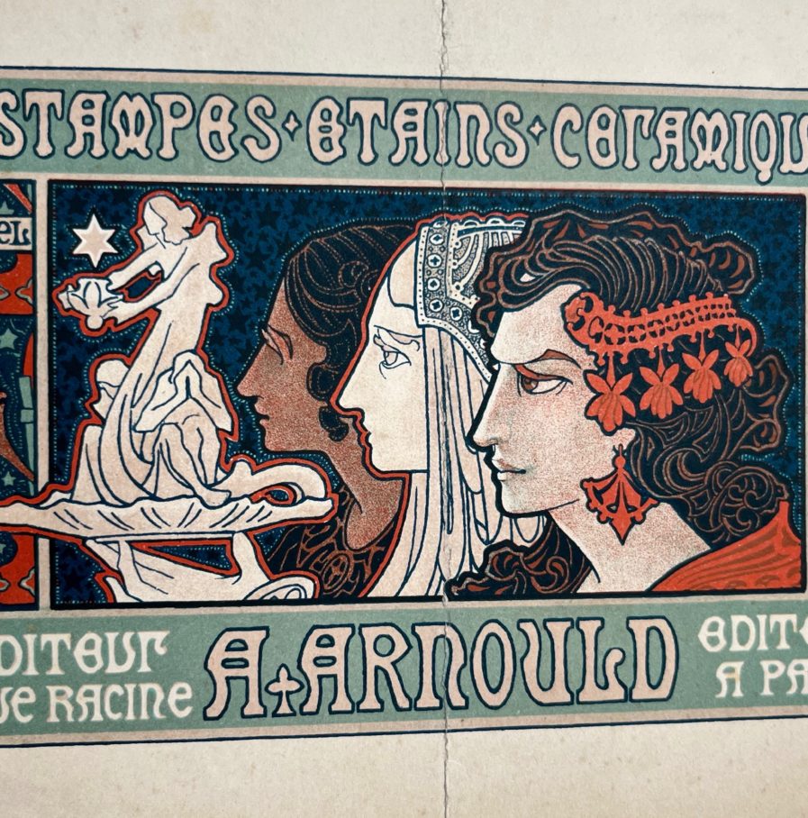 Reçu pour la vente de 3 dessins de Toulouse-Lautrec écrit au dos d'une jolie carte en couleurs d'A. Arnould, "Estampes - Etains - Céramiques, Editeur 7 rue Racine à Paris", d'après Marcel-Lenoir.