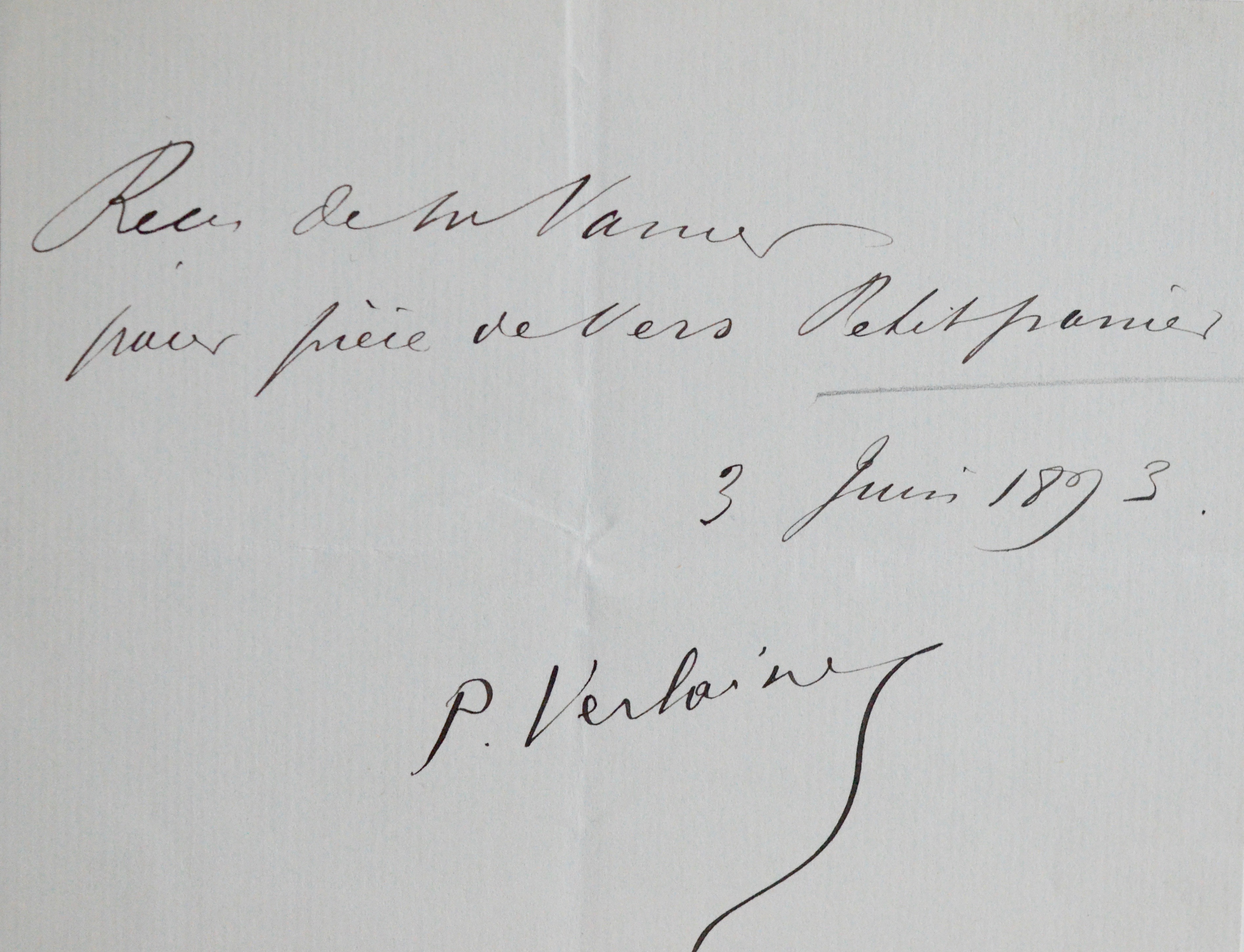 Reçu signé de Paul Verlaine, à « M. Vanier pour pièce de vers Petit panier. 3 juin 1893".