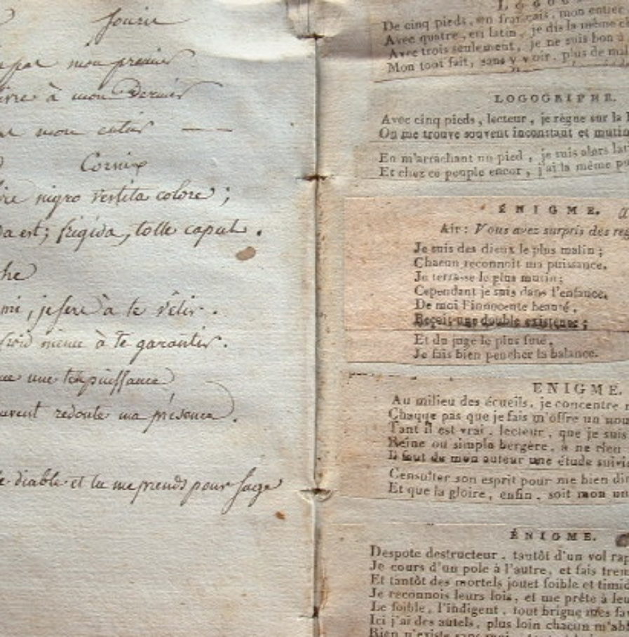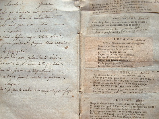 Recueil de plus de 500 logogriphes et charades, en partie manuscrits, en partie découpés dans des journaux. Tous portent, en regard, la solution à l'énigme. Plusieurs font référence à Bonaparte comme Premier consul. Le tout formant un recueil unique, dans une reliure en cartonnage de l'époque.