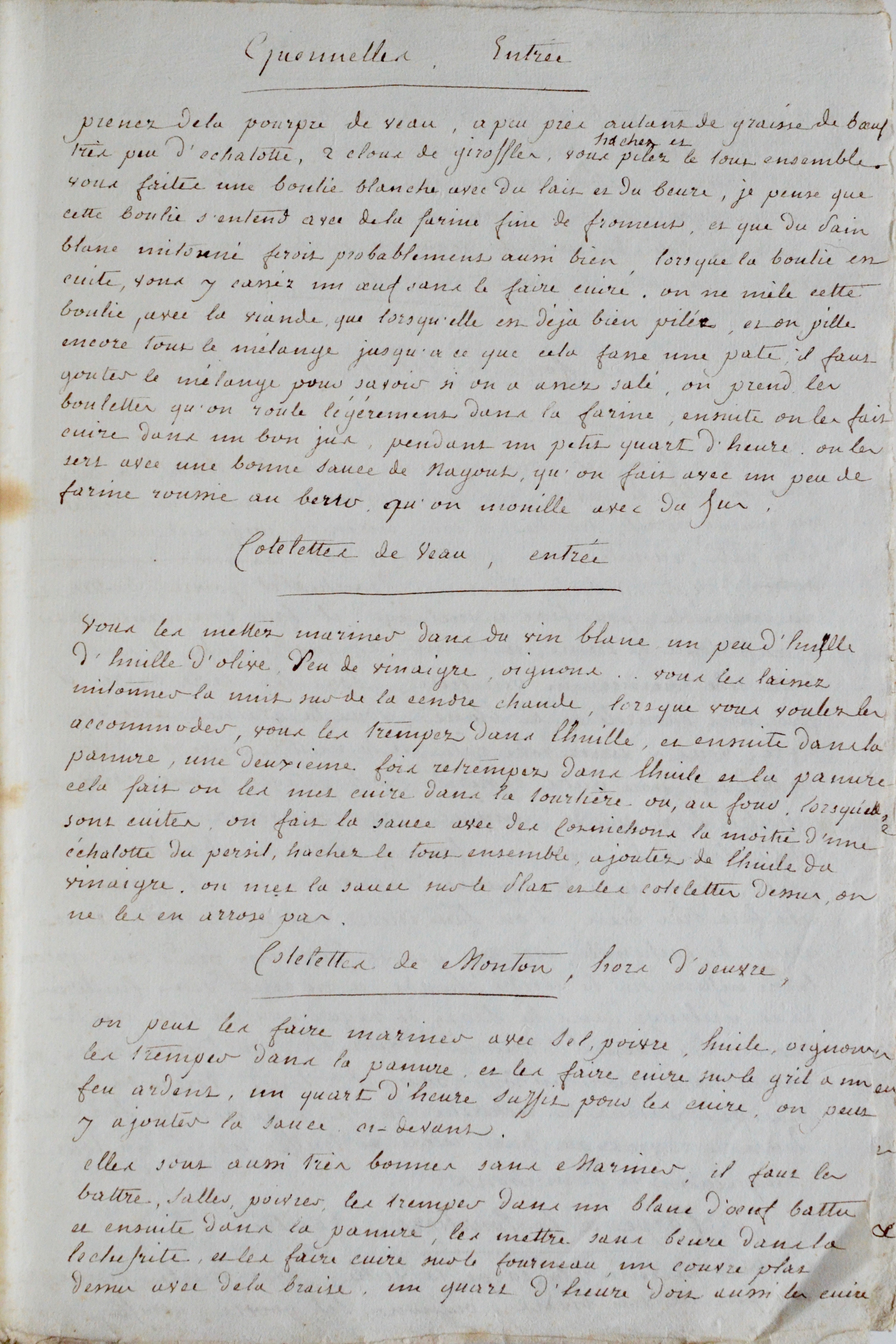 Quenelles, côtelettes de veau, côtelettes de mouton, oeufs au jus, coupe à la tourtière, frangipane, friture d'artichauts, gâteau à mille feuilles, sauce piquante, oeufs en tripe, poulet en caisse, pommade pour les gigots, matelot de poissons, carpe à la minute, crème aux noisettes, oreilles cochon, cervelle de moutons, etc. Suivent de nombreux autres plats de viande, plats en gelée, volailles et gibiers, abats, grenouilles et desserts (pets de nonnes, pets de loups, gaufres, beignets légers, choux, etc.)