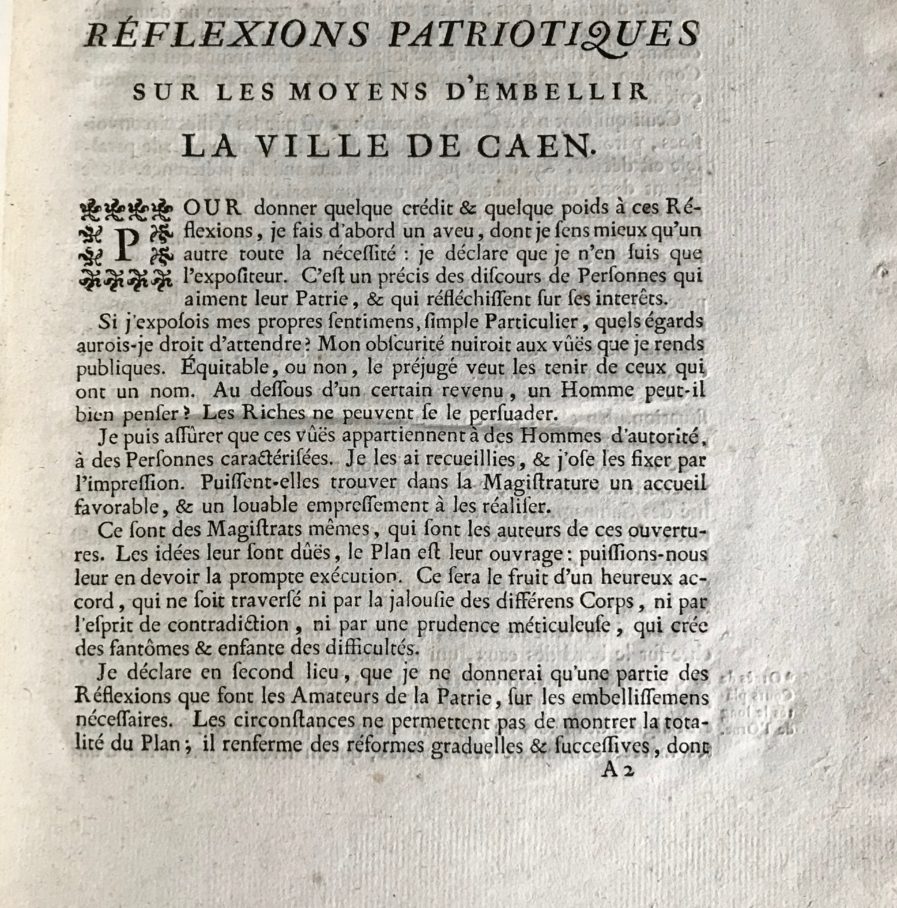 Brochure intitulée : "Réflexions patriotiques sur les moyens d'embellir la ville de Caen". Non rognée.