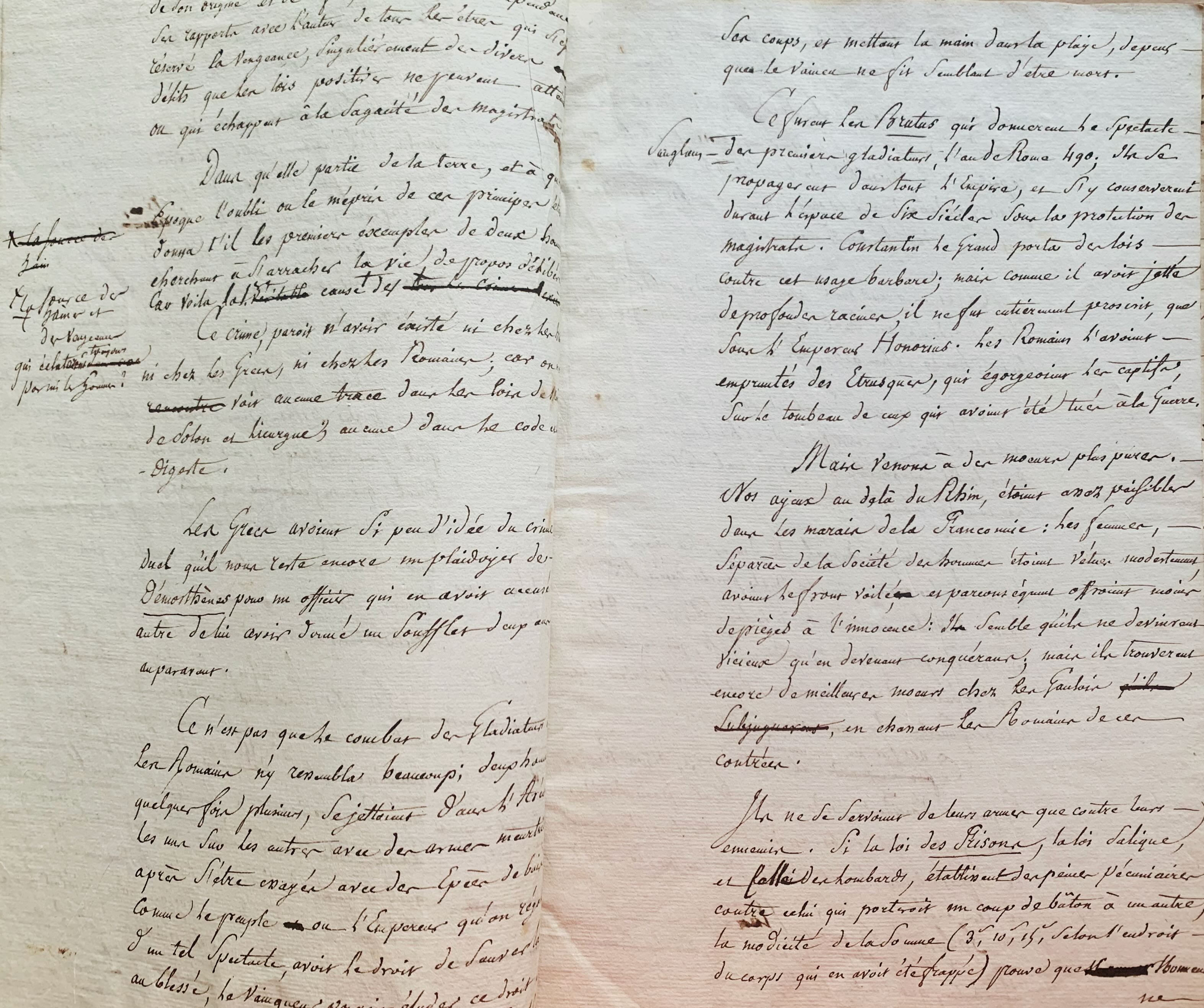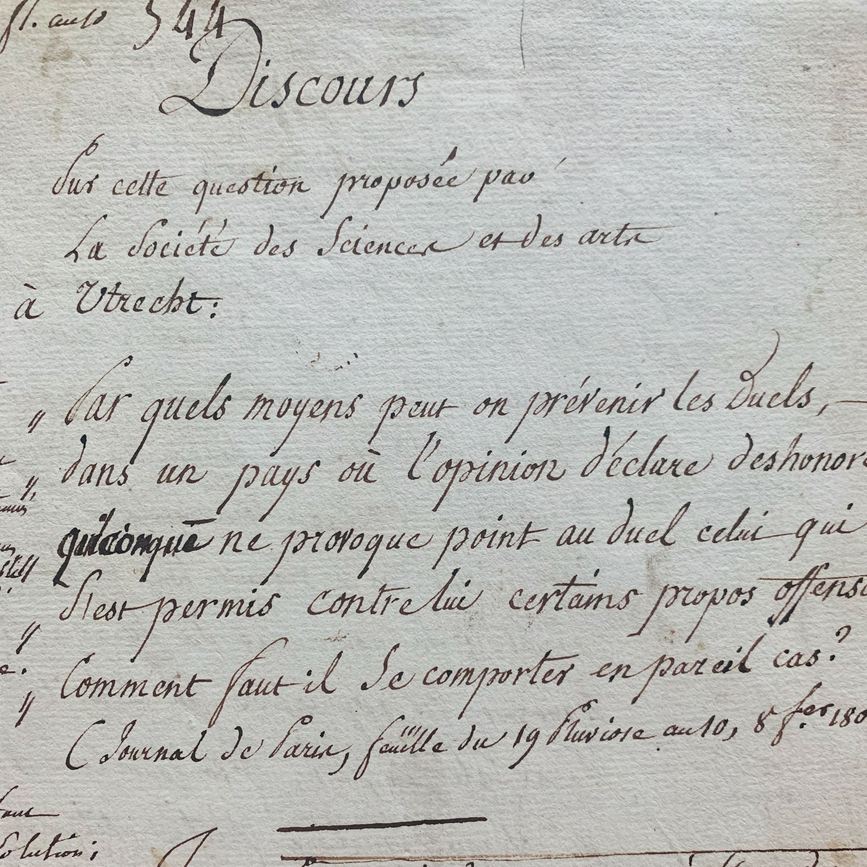 Manuscrit intitulé : "Discours sur cette question proposée par la Société des Sciences et des Arts d'Utrecht", examinant ces questions : "par quels moyens peut-on prévenir les Duels dans un pays où l'opinion déclare déshonoré quiconque ne provoque point au duel celui qui s'est permis contre lui certains propos offensans ? Comment faut-il se comporter en pareil cas ?". L'auteur expose les causes, l'histoire et les progrès des duels qui consacrent la fureur barbare des gladiateurs, et propose divers moyens de lutte, notamment des lois. Nombreuses corrections en marge.