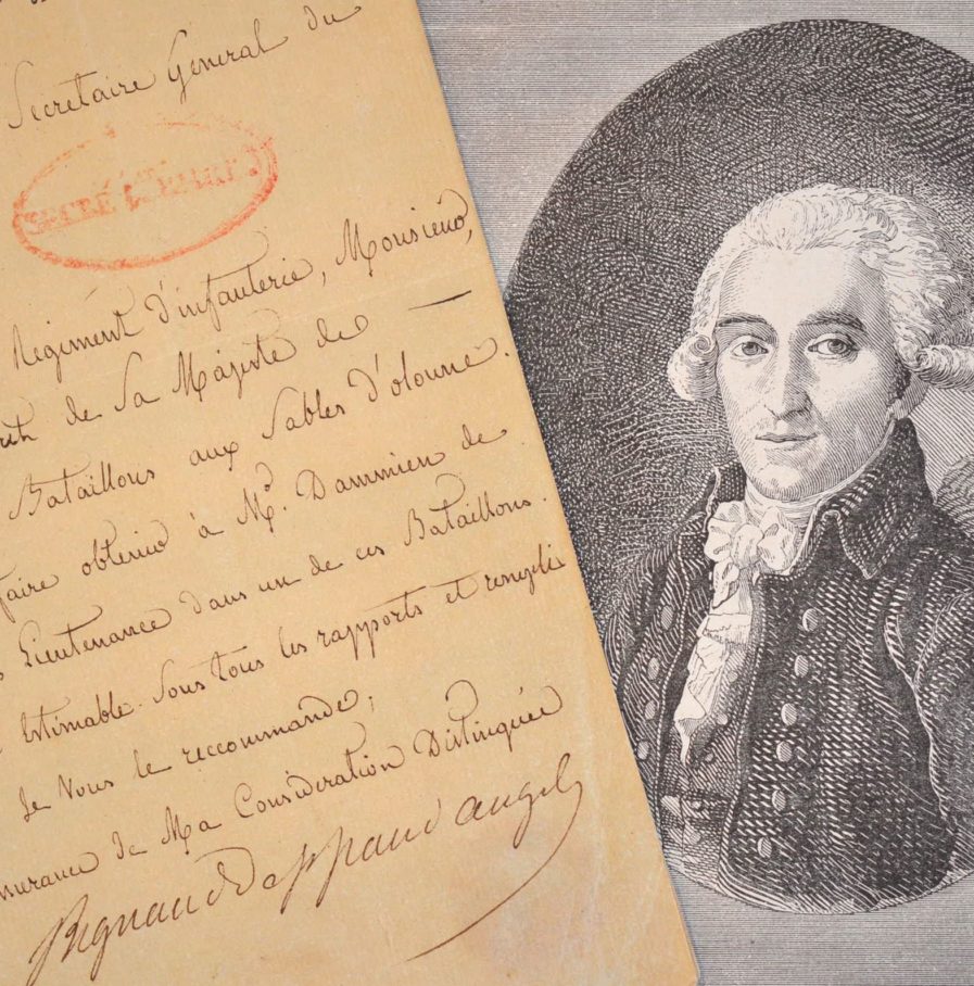 Michel Louis Etienne Regnaud de Saint-Jean d'Angely (comte de) (Saint-Fargeau, 1761/1819)Dans cette lettre, le Conseiller d'Etat Regnaud de Saint-Jean d'Angély recommande au Secrétaire général du Ministère de la Guerre, Pierre-Paul Denniée, un sous-lieutenant : « Le Major du 66e Régiment d'Infanterie, Monsieur, est chargé par un décret de Sa Majesté de l'organisation de deux bataillons aux Sables d'Olonne. Serait-il possible de faire obtenir à M. Dammien de La Rochelle une sous-lieutenance dans un de ces bataillons. Ce jeune homme est estimable sous tous les rapports et rempli de connaissances. » Mention manuscrite en haut : « Je le prie d'examiner et de faire faire une réponse. Il paraît que M. Dammien n'a pas de services. Comment le proposer pour une sous-lieutenance dans un régiment ? ». Joint : le portrait de Regnaud d'après Lambert, réimpression de l'Ancien Moniteur.