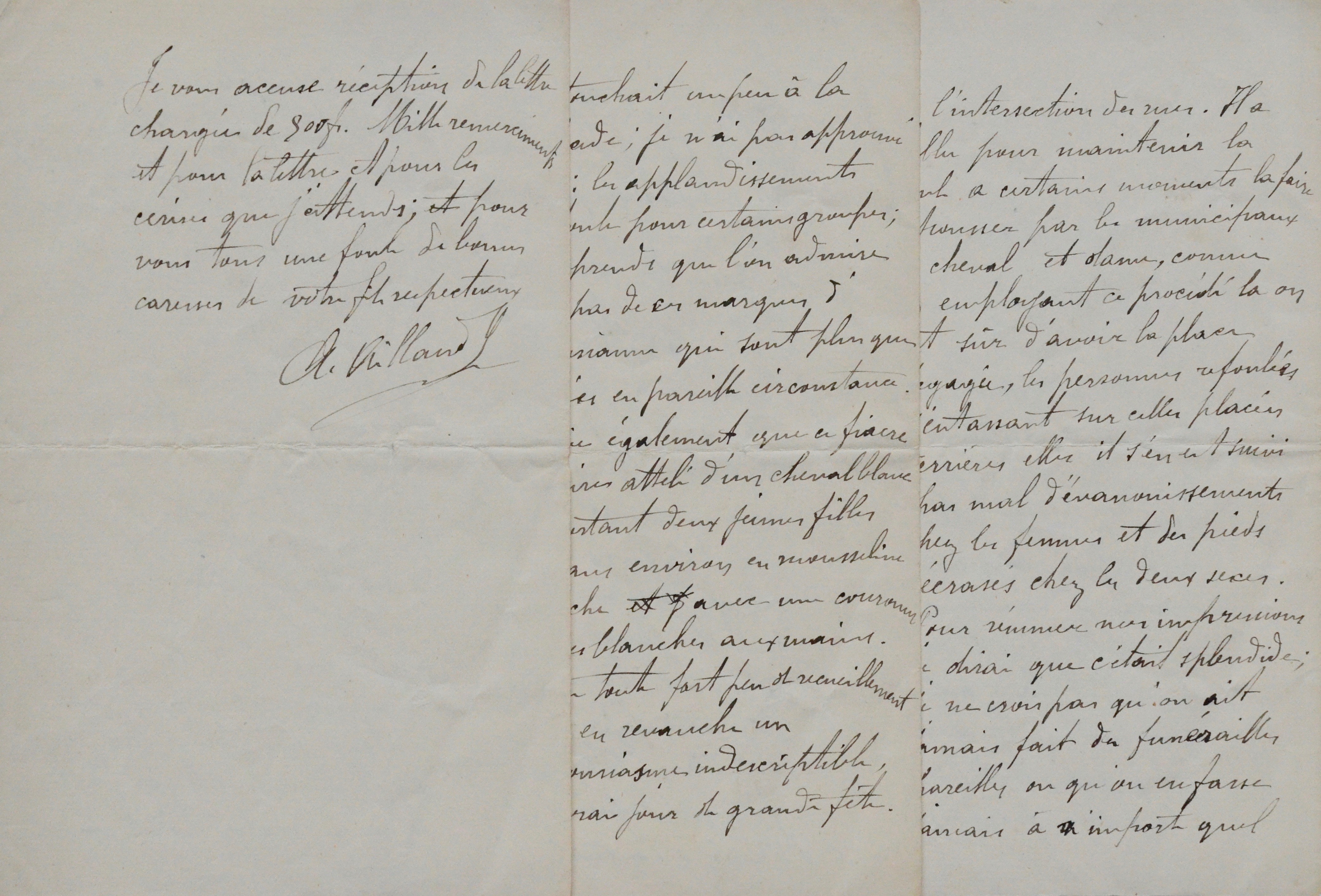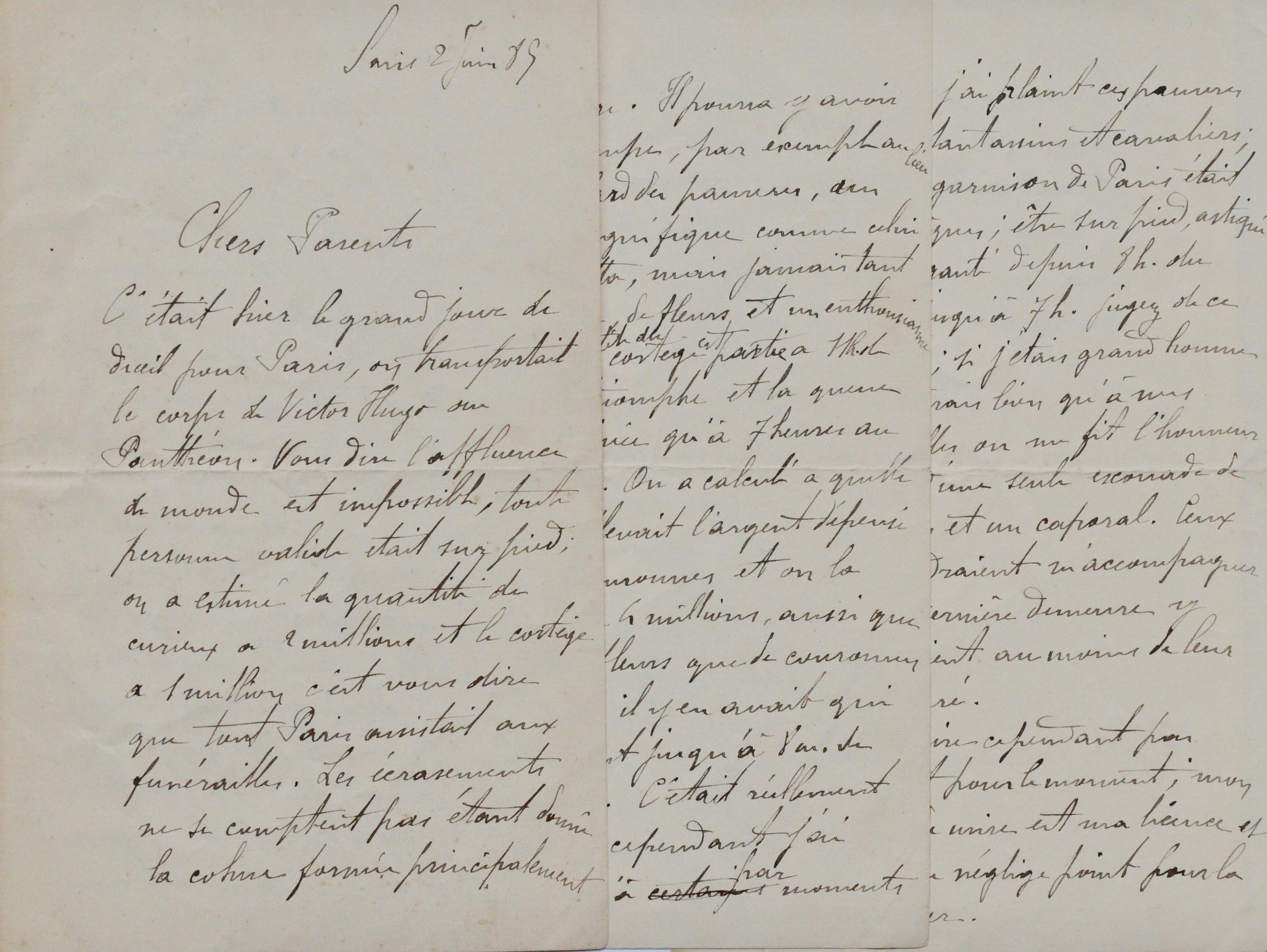 Longue lettre d’un jeune homme à ses parents, signée "A. Aillaud?" [peut-être le parolier Théodore Alexandre Aillaud (1859-1917)?], relatant les funérailles nationales de Victor Hugo, auxquelles il venait d’assister la veille, le 1er juin 1885.