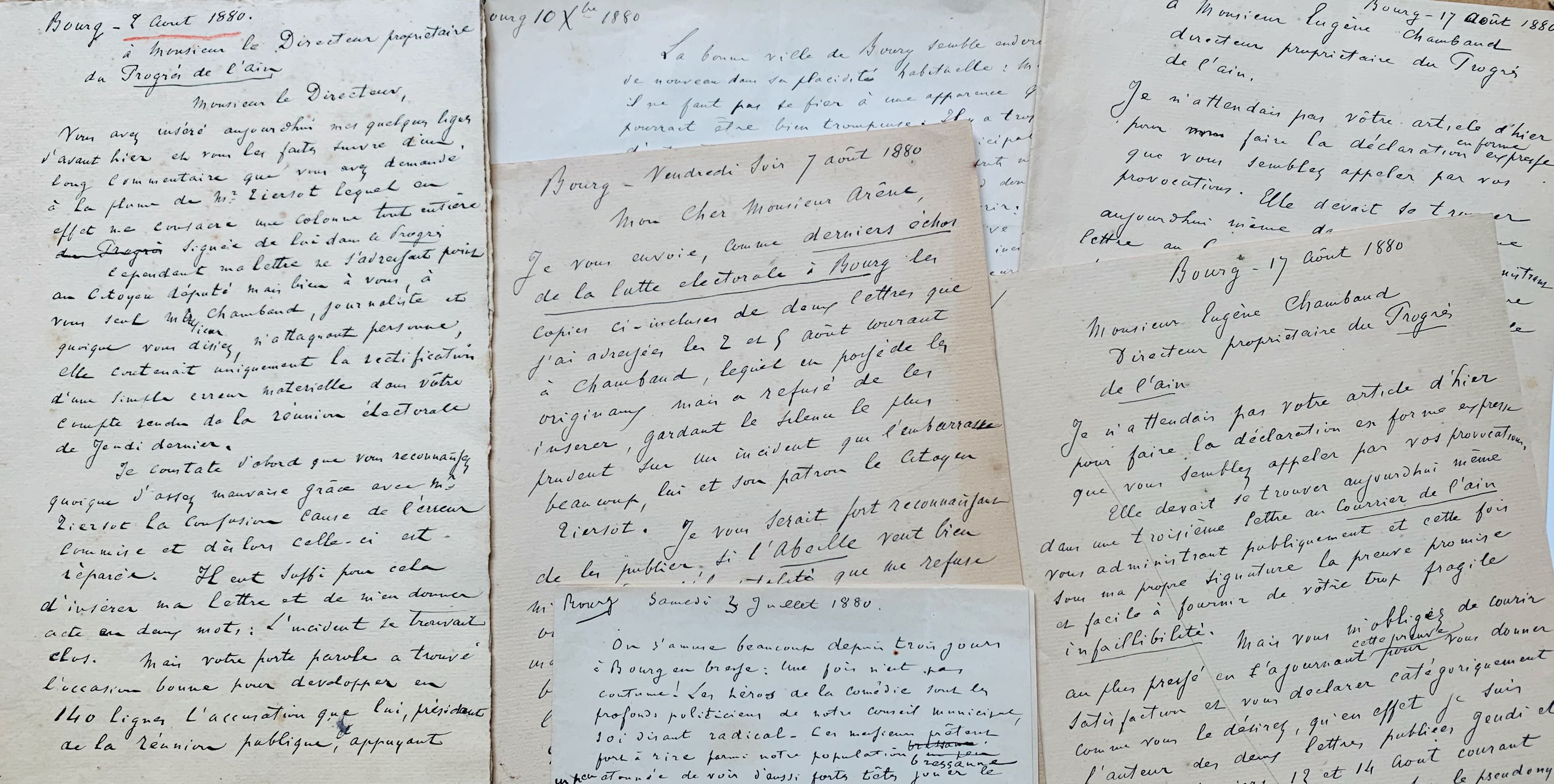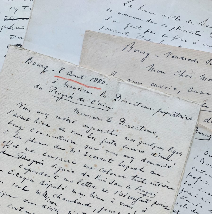 - 3 L.A.S. (brouillons) à Eugène Chambaud (directeur et propriétaire du Progrès de l’Ain) et 1 L.A.S. (brouillon) à M. Arêne (directeur de l’Abeille). 13 pp. in-4. Bourg, 2 – 17 août 1880. Sur la même affaire et les rivalités entre les 2 journaux. « Je vous envoie, comme derniers échos de la lutte électorale à Bourg, les copies ci-incluses de deux lettres que j’ai adressées les 2 et 5 août courant à Chambaud, lequel en possède les originaux mais a refusé de les insérer, gardant le silence le plus prudent sur un incident qui l’embarrasse beaucoup, lui et son patron, le citoyen Tiersot […] ».