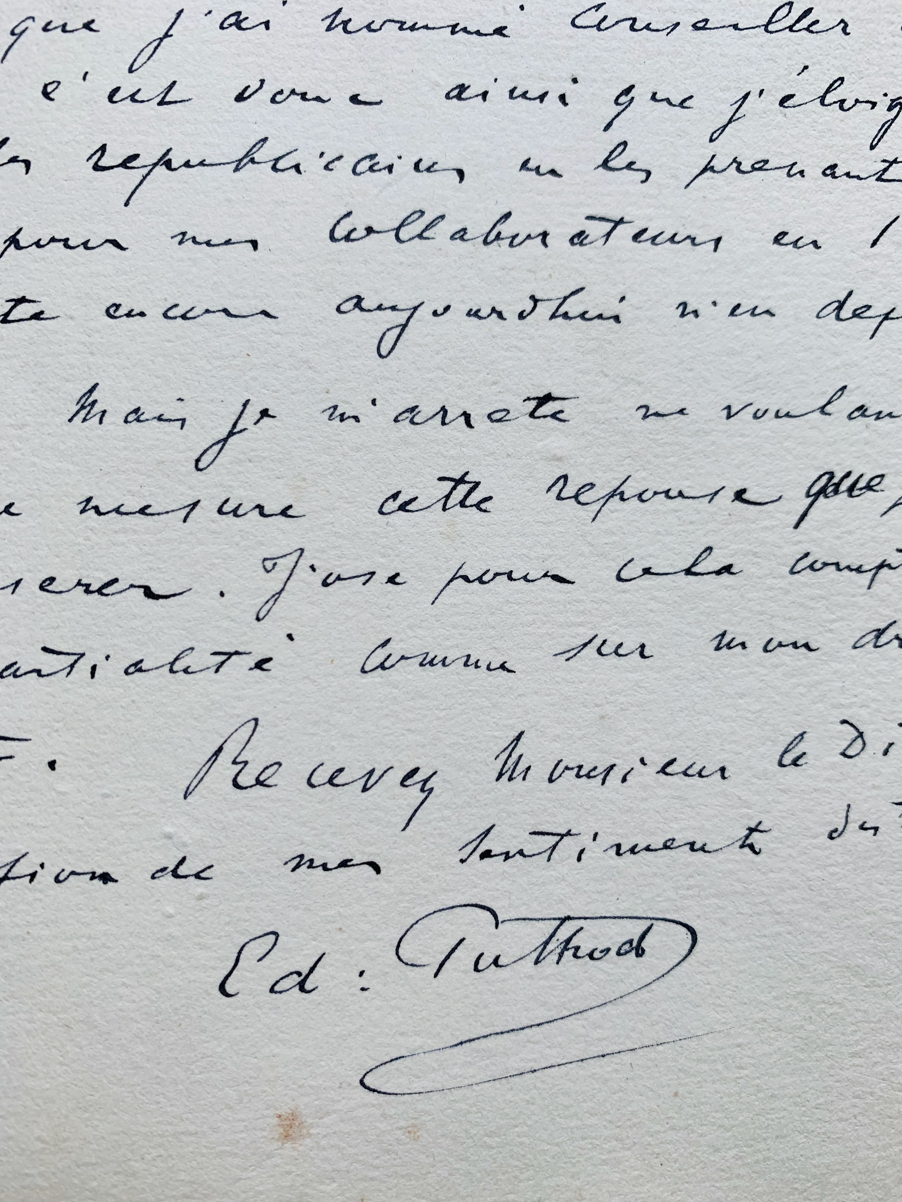 - Manuscrit de 4 pp. in-8, Bourg 3 juillet 1880, racontant la situation : « On s’amuse beaucoup depuis trois jours à Bourg en Bresse : une fois n’est pas coutume ! Les héros de la comédie sont les profonds politiciens de notre conseil municipal, soit disant radical. Ces messieurs prêtent fort à rire parmi notre population bressane un peu étonnée de voir d’aussi fortes têtes jouer le rôle de mystifiés avec une si parfaite candeur et un oubli non moins parfait de tout sentiment de patriotisme […] ».