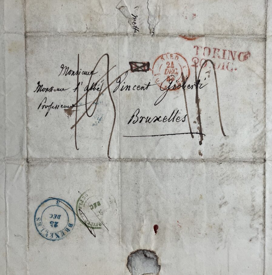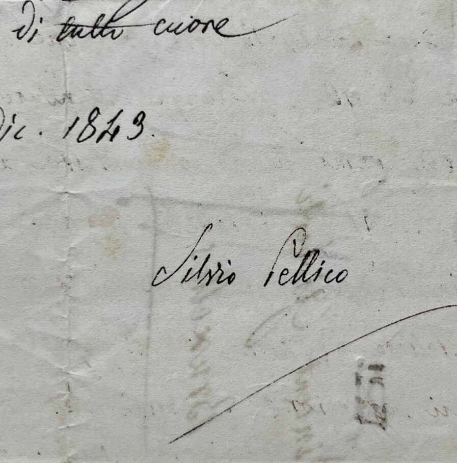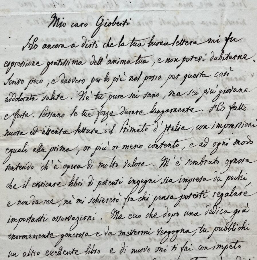 Traduction : "J'écris peu, et la plupart du temps, je ne peux vraiment pas en raison de ma mauvaise santé. Tu n’es pas non plus en bonne santé, mais plus jeune et plus fort. Que ta force dure longtemps. J'ai fait une nouvelle et attentive lecture de la Primauté d'Italie, avec des impressions égales à la première [...] il me semble que c'est une œuvre de grande valeur. Il m'a toujours semblé que critiquer les livres d'esprits puissants était une entreprise réservée à quelques-uns, et non à moi, et je ne me rangerais pas non plus du côté de ceux qui pensent pouvoir donner des observations importantes. Mais ici, après un dévouement déjà extrêmement généreux, tu publies un autre excellent livre, et une fois de plus, tu fais de moi une apologie chaleureuse et, je dirais, passionnée, avec un élan d'amitié. [...] Je ne sais rien de l’opinion que les gens défavorables ont de moi, quelle que soit la bannière qu’ils suivent. En cela, toi et moi, possédons la même hauteur et la même insouciance. Mon intellect manque de force, mais pas mon âme, et je souris à ceux qui, en m'accusant soit par des lettres anonymes, soit ouvertement [...]. L'excellente substance de tes livres serait la même, mais elle serait peut-être plus bienvenue, plus utile. Je n'ai rien d'autre à t'écrire, mon Gioberti, mais je t'aime d'une estime très particulière, très élevée, et je te juge sur les faits. Mon frère t'aime et te salue. Si tu vois le bon Giovanni Arrivabene [Giovanni Arrivabene (1787-1881), homme politique et intellectuel italo-belge], Berchet [Giovanni Berchet, poète, patriote et député italien (1783-1851)] et Arconati [le riche politicien Giuseppe Arconati Visconti (1797-1873) en exil dans son château de Gaasbeek, où il hébergea ses amis précédemment cités], dis-leur bonjour. Mes salutations à la Comtesse de Lalaing. Je t'embrasse de tout mon cœur. Silvio Pellico".