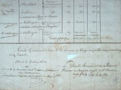 Gustave Croy-Solre (prince de) (Château de l'Ermitage, près de Condé, 1773/1844)"Etat du traitement de MM. les chanoines du 2ème ordre, des autres ecclésiastiques et des frais d'entretien ordinaire du chapitre royal de Saint-Denis, pendant le deuxième trimestre de 1822, à ordonnancer sur le crédit de 200.000 f. ouvert par les ordonnances du 23 décembre 1816, 17 mars 1819 et 10 août 1820". Présenté sous forme de tableau qui répertorie le nom, la qualité et l'émargement des chanoines, ainsi que la durée de fonction, le montant du traitement et la "somme à ordonner à raison du service effectif". Chaque chanoine a signé le document en échange de son traitement. Sont également détaillées les "dépenses de la maison des clercs" : emploi des professeurs, entretien des jeunes clercs, des enfants de choeur, etc. Le document est en outre approuvé et signé par le grand aumônier de France, le prince de Croÿ.