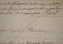 Ordre de payer la somme de 5860 livres "à M. Huet, fermier de la Principauté de Monaco, pour supplément de 9 d. par ration de pain fourny aux troupes de Monaco pendant l'année 1747". Le document, signé par le donneur d'ordre, a été biffé après l'acquittement. Il est signé par Huet au dos.