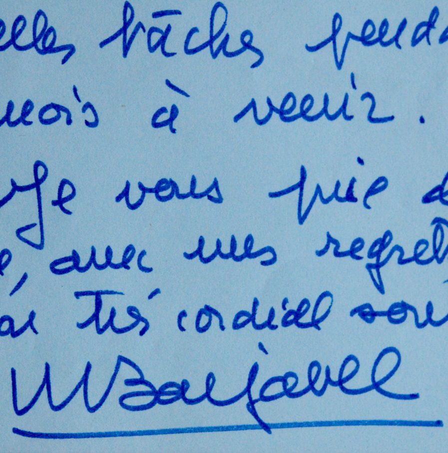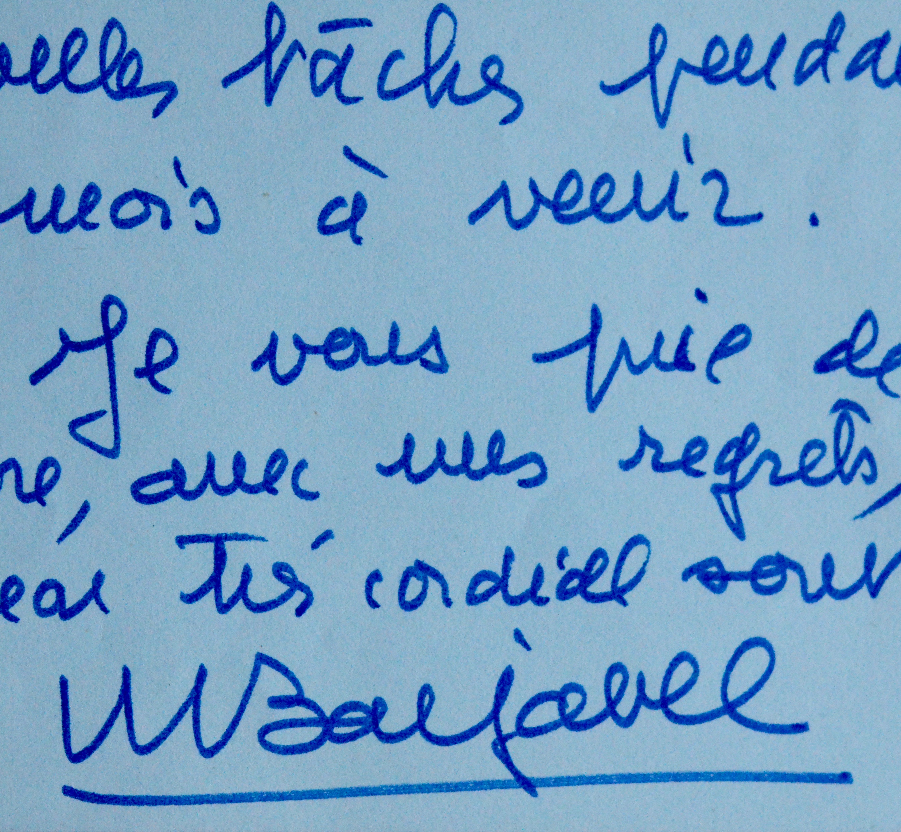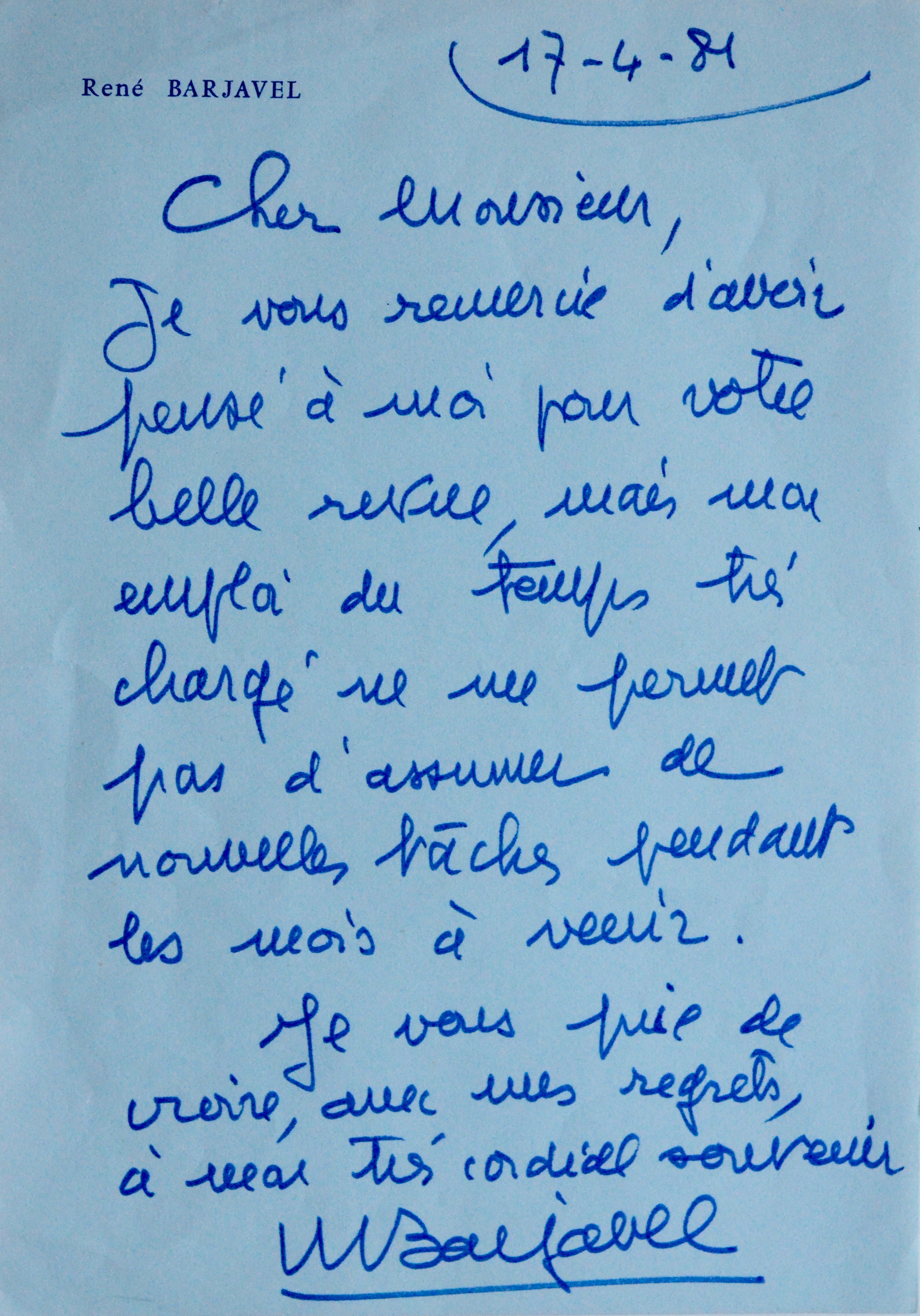 Barjavel décline une proposition de collaboration à une revue : "Je vous remercie d'avoir pensé à moi pour votre belle revue, mais mon emploi du temps très chargé ne me permet pas d'assumer de nouvelles taches pendant les mois à venir [...]"