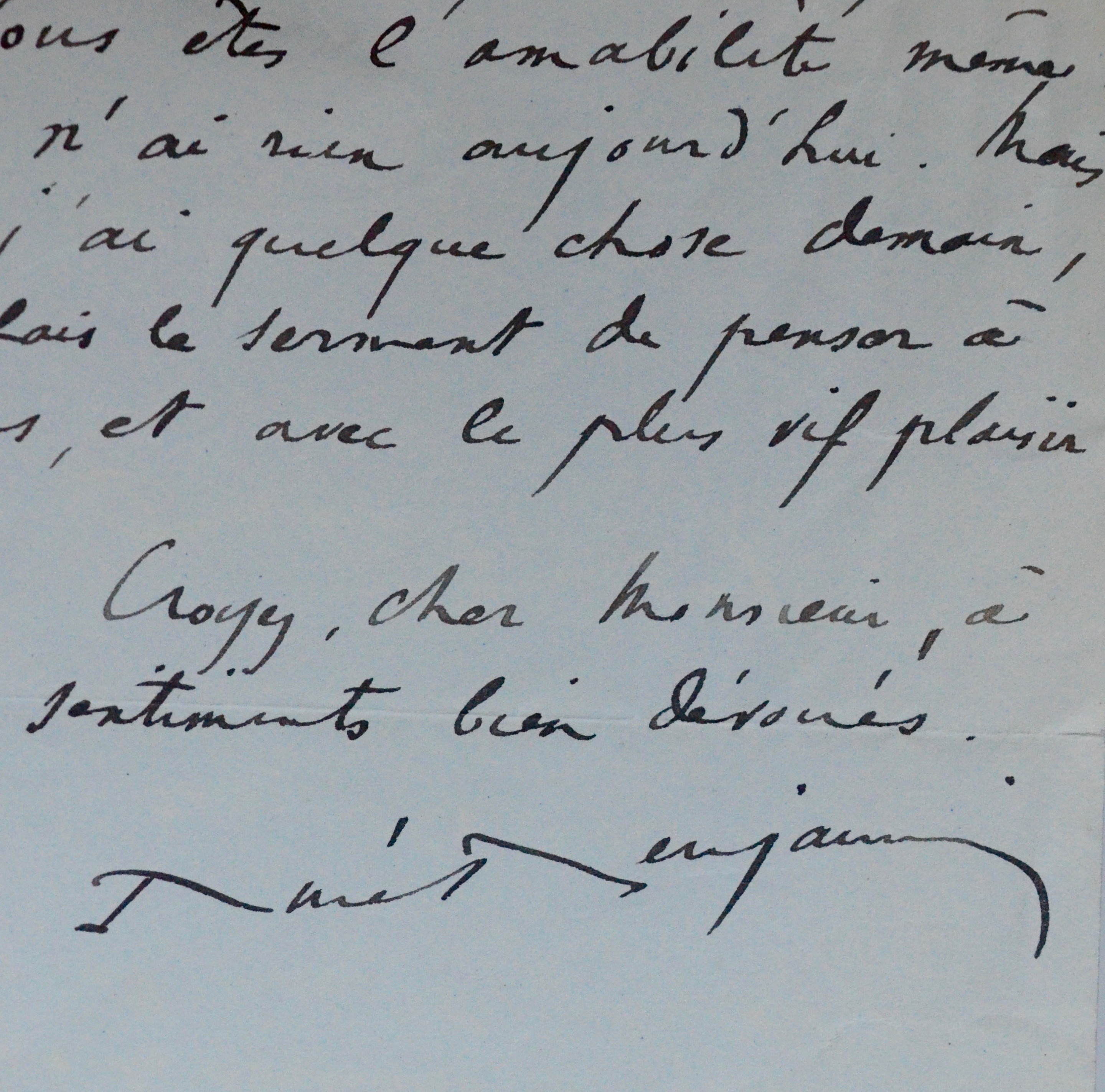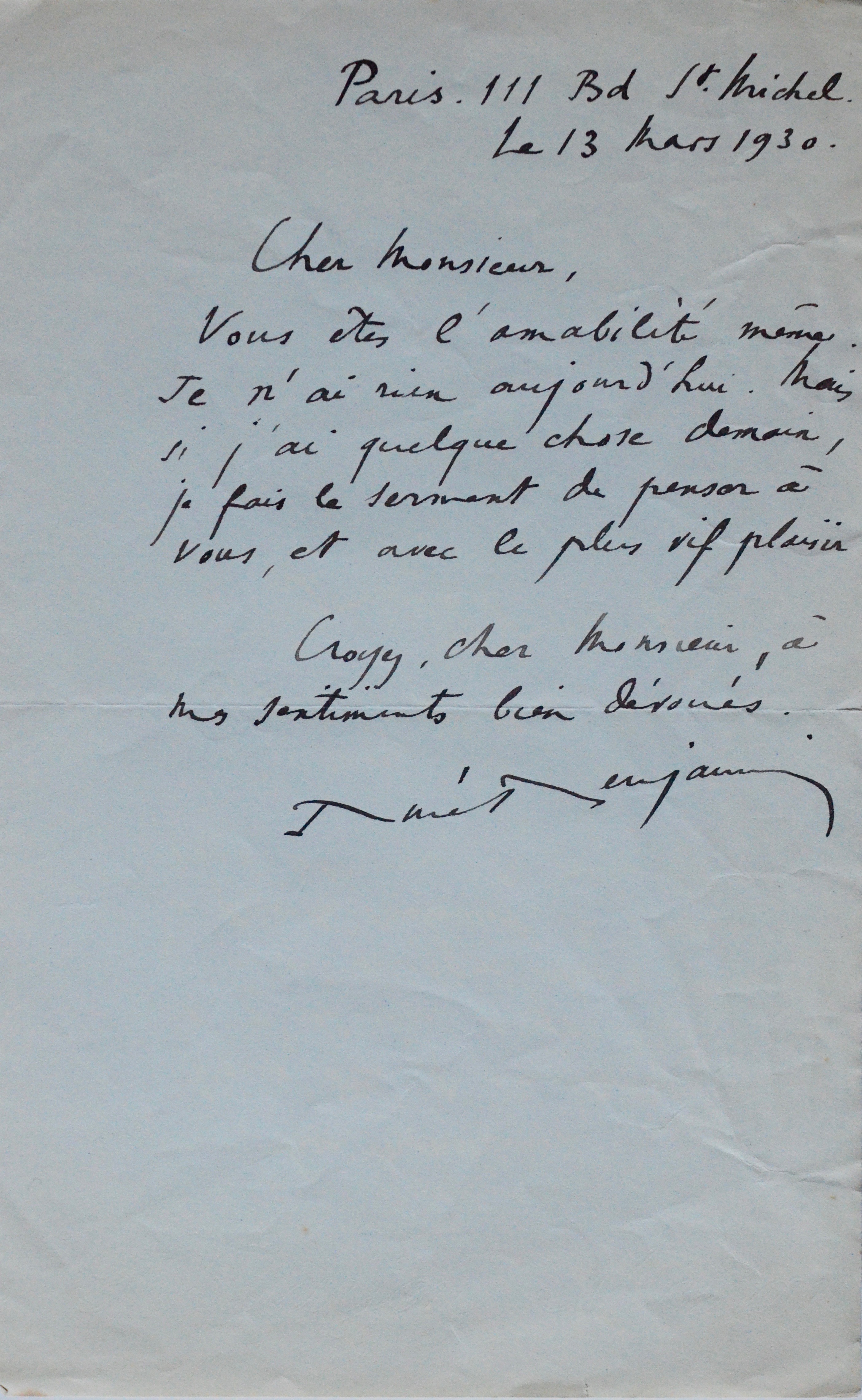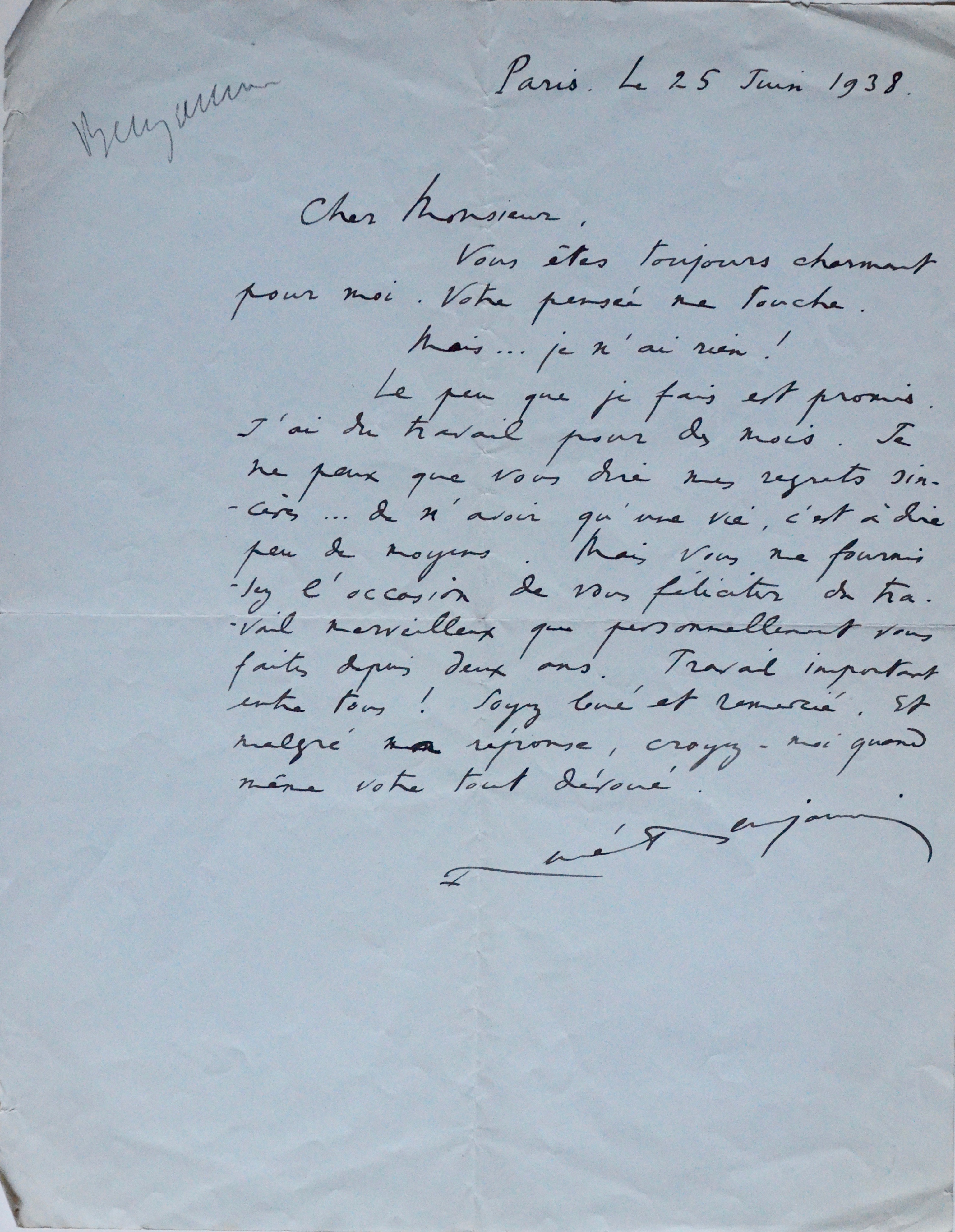 1938 : "Vous êtes toujours charmant pour moi. Votre pensée me touche. Mais... je n'ai rien ! Le peu que je fais est promis. J'ai du travail pour des mois [...]. Vous me fournissez l'occasion de vous féliciter du travail merveilleux que personnellement vous faites depuis deux ans ! Travail important entre tous ! Soyez loué et remercié [...].