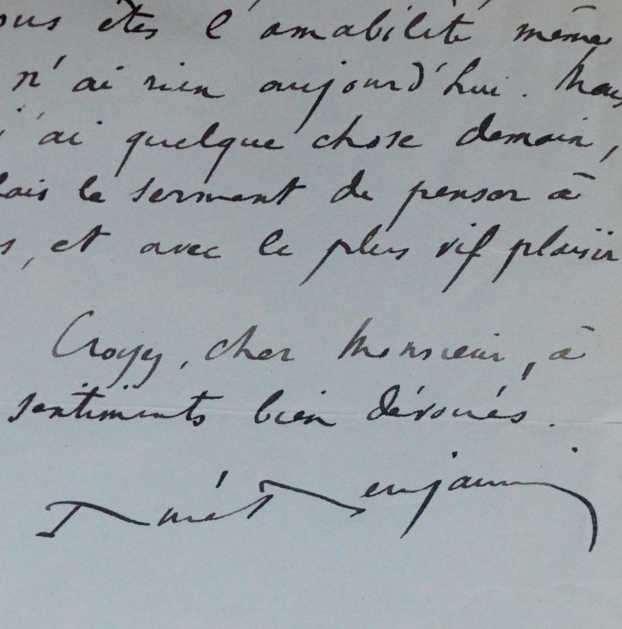1938 : "Vous êtes toujours charmant pour moi. Votre pensée me touche. Mais... je n'ai rien ! Le peu que je fais est promis. J'ai du travail pour des mois [...]. Vous me fournissez l'occasion de vous féliciter du travail merveilleux que personnellement vous faites depuis deux ans ! Travail important entre tous ! Soyez loué et remercié [...].