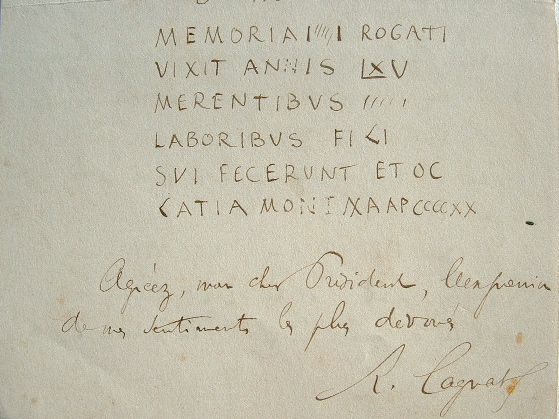 René Cagnat donne sa lecture d'une inscription antique que son correspondant lui a transmis par l'intermédiaire d'un cliché photographique. Après quelques notes d'interprétation, il livre sa lecture, sur 7 lignes : «D M S / MEMORIAI I ROGATI [...]», avec le nom de celle qui a fait le monument.