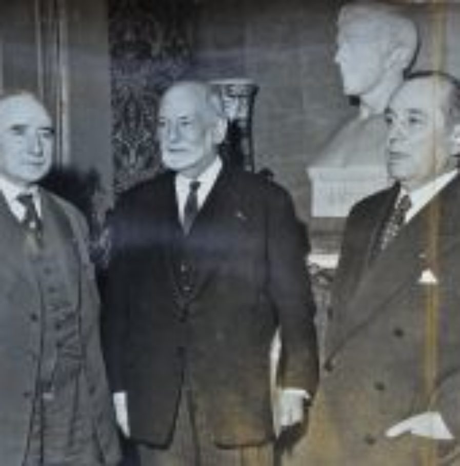 René Cassin entouré de Nicolas Battestini, premier président de la Cour de Cassation et Roger Léonard, président de la Cour des Comptes. Légende au dos : les trois sages qui forment la commission provisoire constitutionnelle doivent examiner les 22 dossiers de contestation d'élections.