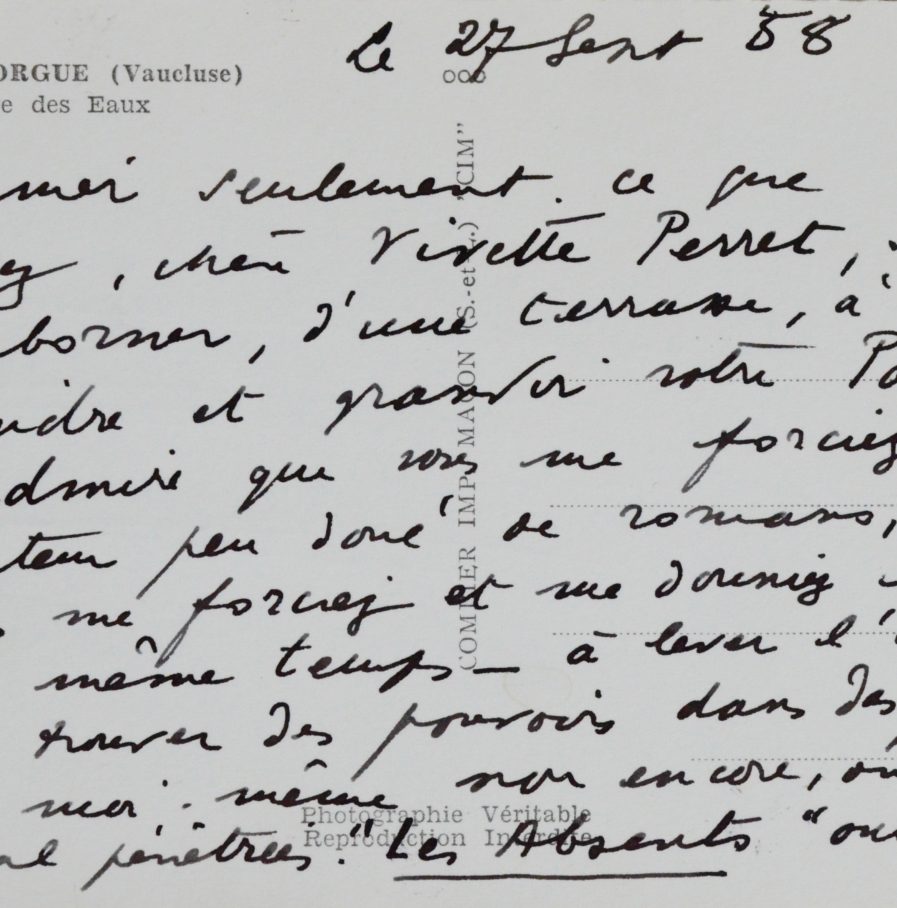 René Char (L'Isle-sur-la-Sorgue, 1907/1988)Carte postale autographe signée de René Char, adressée à Geneviève Bloch-Michel, sous son pseudonyme Vivette Perret.