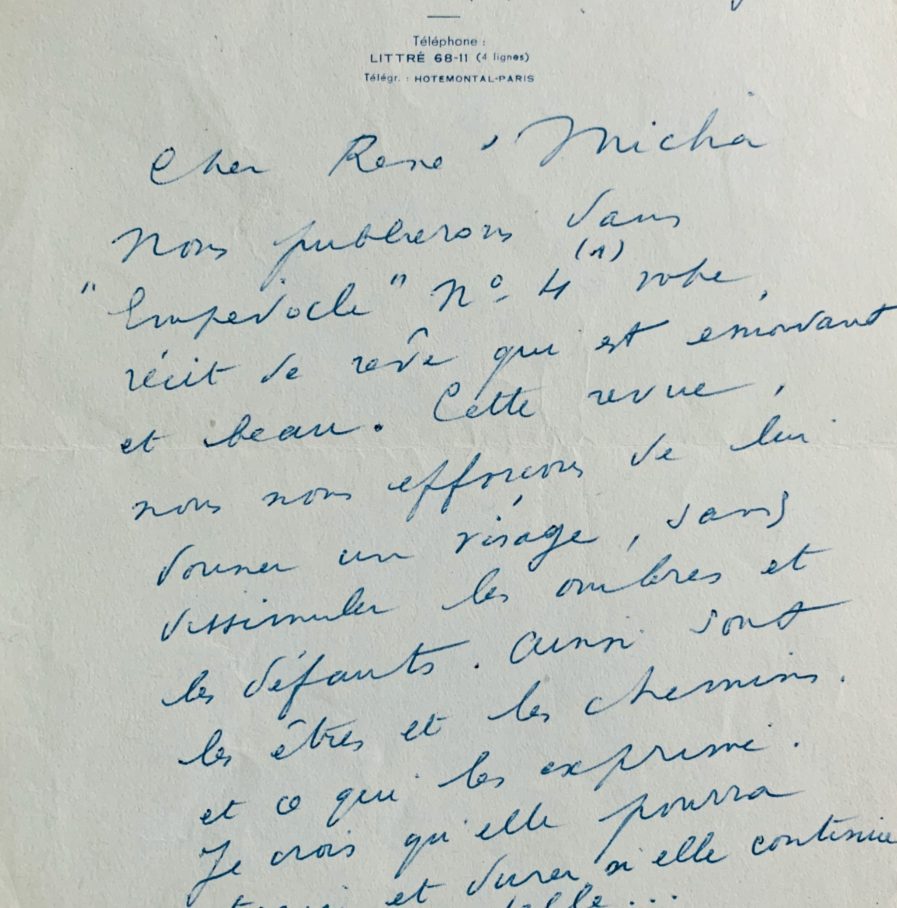 René Char fait publier le récit du rêve de René Micha, dans la revue d’Albert Camus, Empédocle