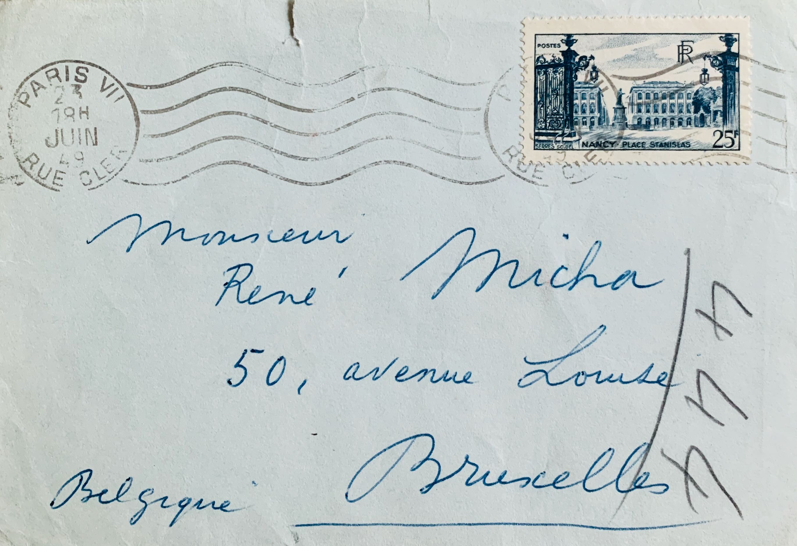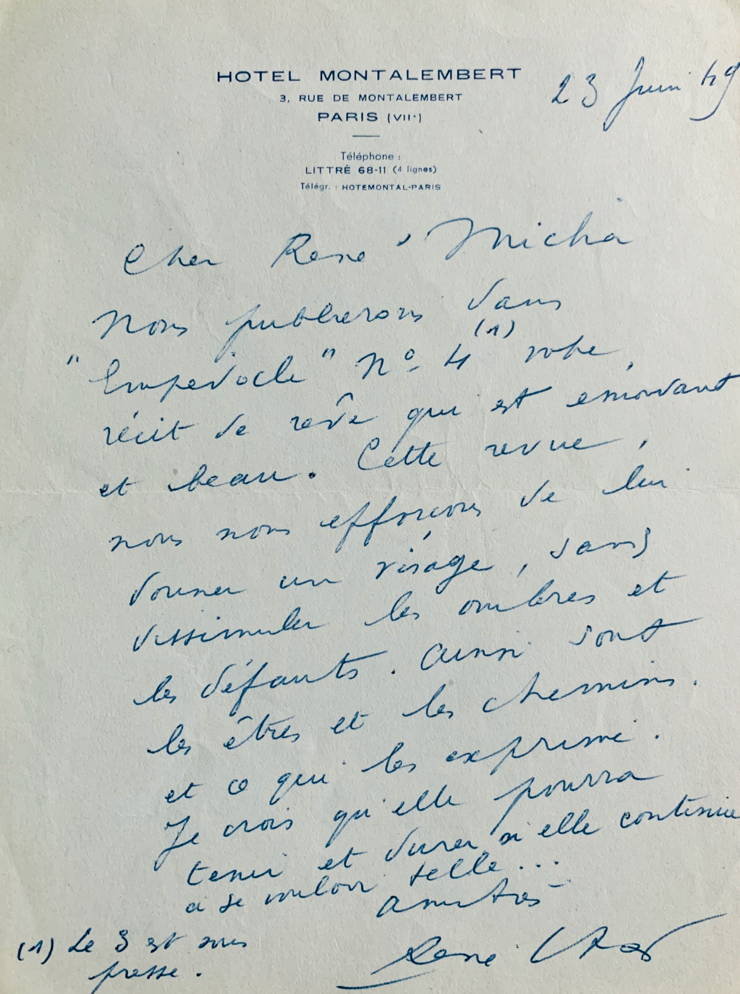 Sur papier à lettre de l'Hôtel Montalembert. Avec enveloppe.