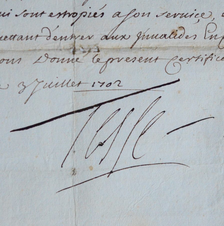 Une apostille au verso (Marseille, 30 août 1702) stipule que le fameux Sanssoucy a touché dix livres et a intégré l'hôpital des Invalides.
