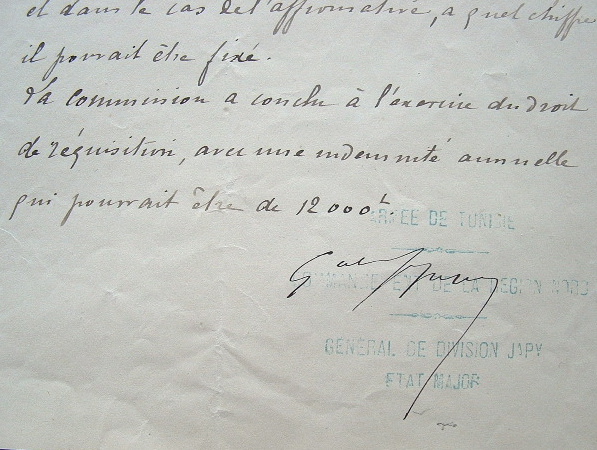 Le général Japy adresse le procès verbal de la conférence du 18 novembre qui avait pour objet de déterminer «si l'occupation du palais Kérédine devait, sans les circonstances qui la motivent, donner droit à loyer [...]». Il l'informe des conclusions : «La commission a conclu à l'exercice du droit de réquisition, avec une indemnité annuelle qui pourrait être de 12.000 f.».