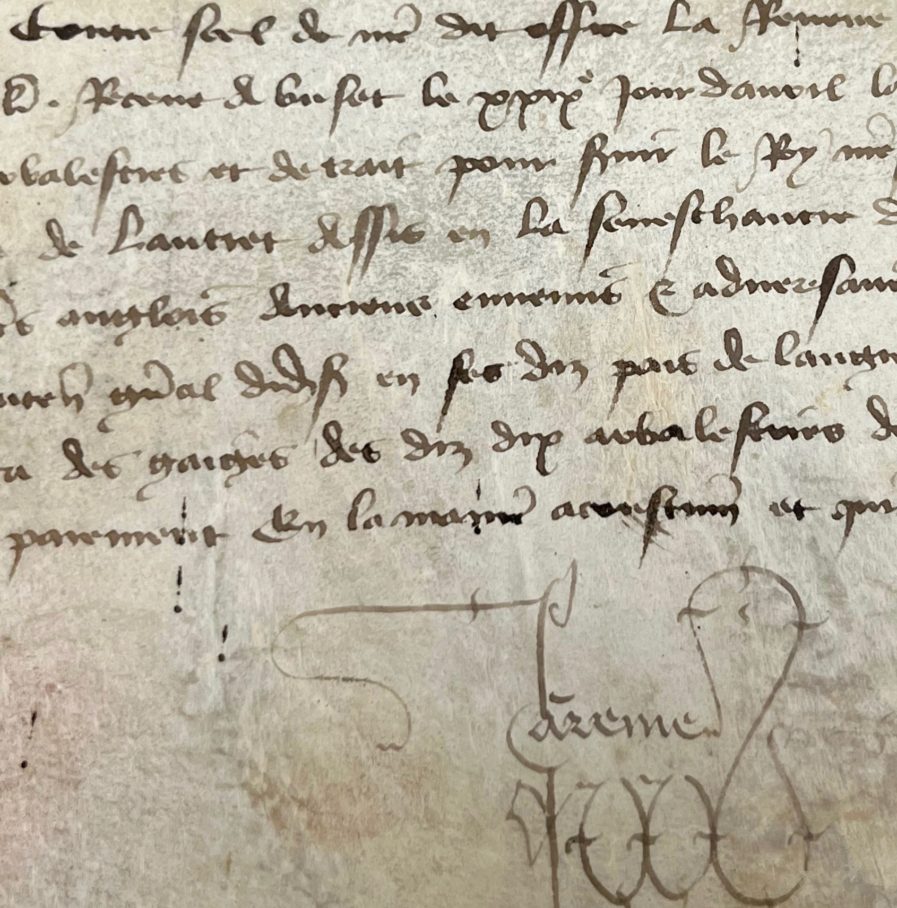"Le maistre des arbalestriers de France à Jehan Seaume receveur général de toutes finances et trésorier des guerres et pais de Languedoc et duché de Guienne ou à son lieutenant salut. Nous vous envoyons attache à ces présentes soubz le contre scel de nostre dit office la Reveue de dix arbalestriers retenuz en la compagnie de messire Augier de la Roca [Roque ?] chevalier, receus à Buset le XXIXe jour d’avril lan mil CCCC vint et sept après Pasques, souffisamment garniz et habillez d’arbalestres et de trait pour servir le Roy messire en ses guerres contre les Anglois estant de présent en garnison dedans le lieu de Lautrec assis en la Sénéchaussée de Carcassonne. Et par tout ailleurs ou besoing sera à l’encontre de tous autres anglois anciens ennemis & adversaires du Roy nostre dit seigneur, soubz le gouvernement de messire Jehan conte de Foix lieutenant général dudit seigneur en son diz pais de Languedoc et duché de Guienne. Sy vous mandons que audit messire Augier de la Roca des gaiges des diz dix arbalestriers de sa ditte chambre et retenue selon laditte reveue, vous faites prest compte et paiement en la manière acoustumée et qu’il appartient. Donné soubz nostre dit scel lan & jour dessus dit".