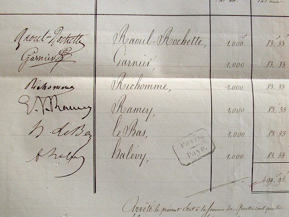 Feuille d'émargement des indemnités reçues par les membres de la Commission du dictionnaire de la langue des Beaux-Arts, qui reçoivent chacun 1.000 francs par an. Tous membres de l'Académie des Beaux-Arts, chaque artiste a signé en face de son nom : Raoul-Rochette, Charles Garnier, Richomme, Ramey, Le Bas et Fromental Halévy.