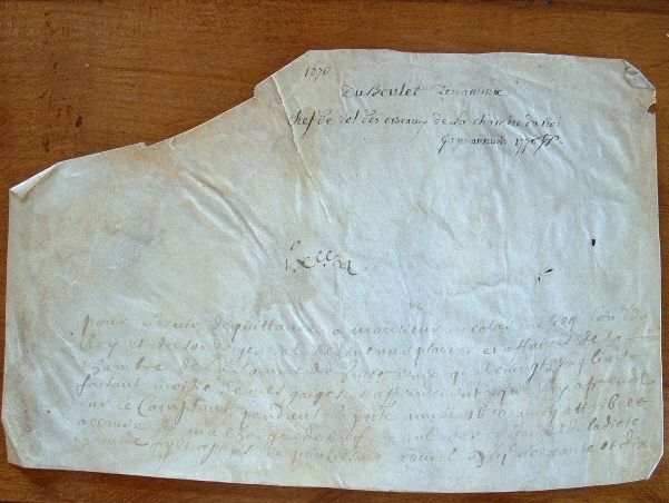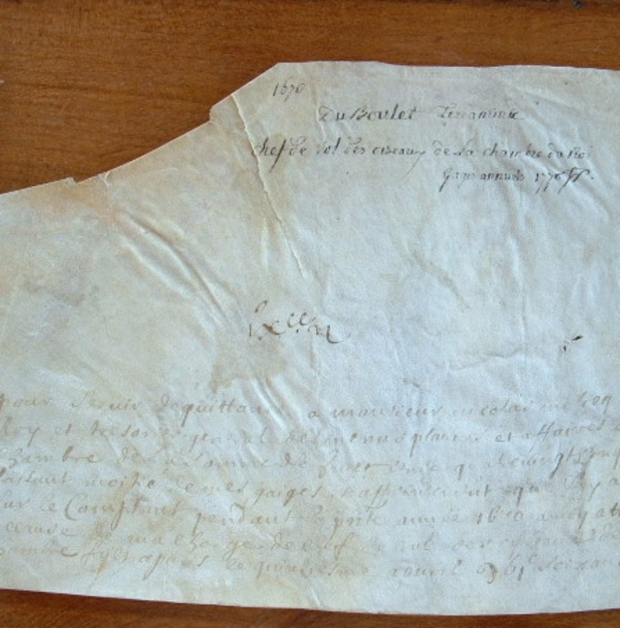 Rétribution de 885 livres au sieur Du Boulet Terramine, d'une demi-année d'appointements, pour sa charge de chef de vol des oiseaux de la Chambre du Roi. Document signé au dos, par l'intéressé.