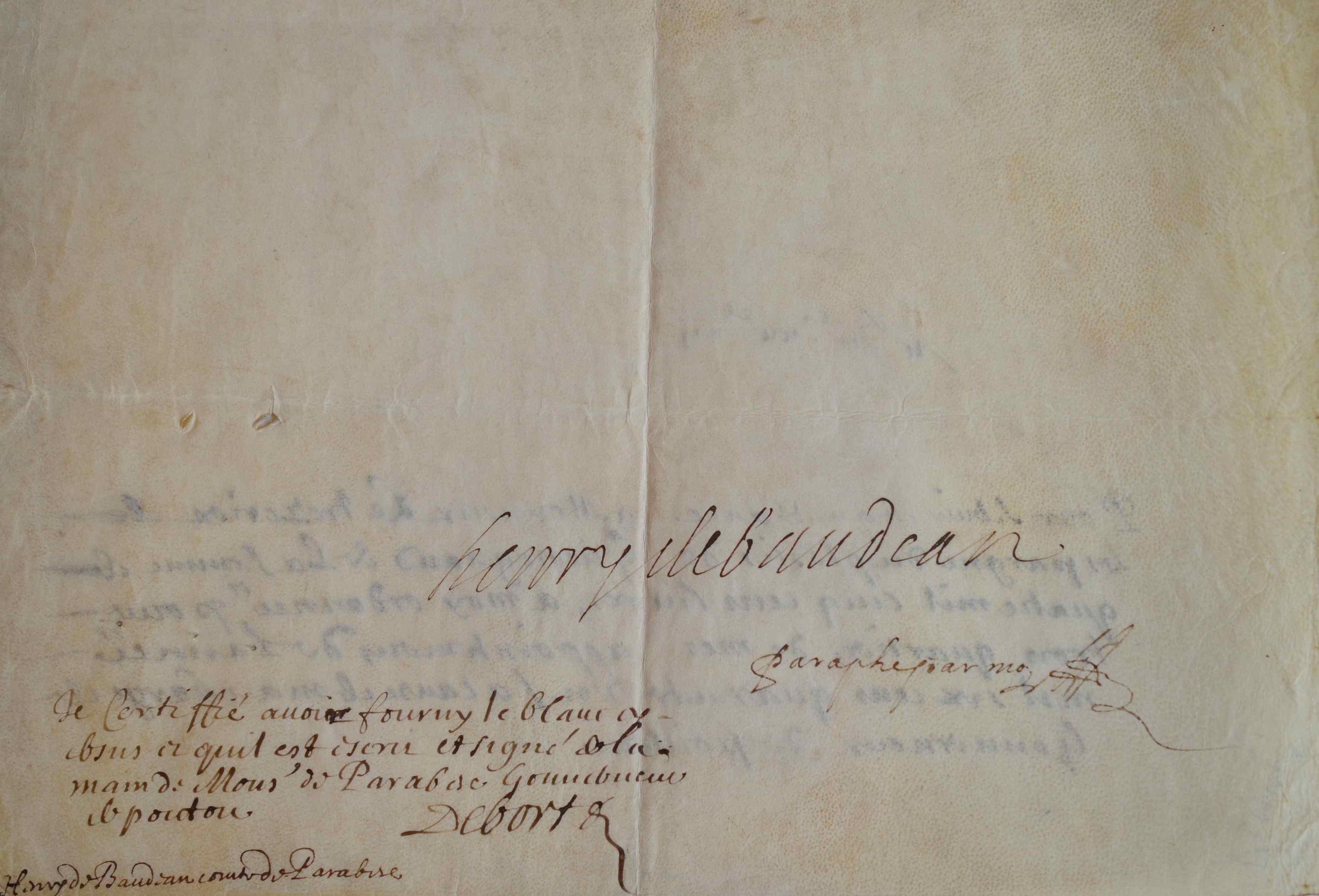Reçu signé par Henry de Baudéan, comte de Parabère (1594/1653), "pour trois quartiers de mes appointements de l'année mil six cens quarante un à cause de ma charge de gouverneur de Poitou" [poste qu'il occupa de 1633 à 1646].