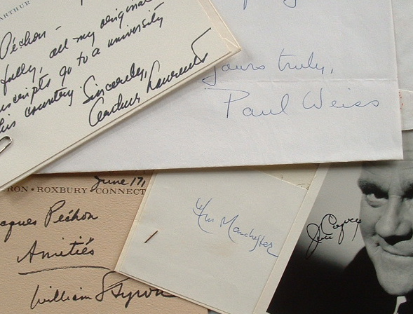 Courts billets en réponses à des demandes d'autographes par Robert Penn Warren, Paul Weiss, Elisabeth Yates, Irwing Wallace, Léon Uris, William Styron, Frank G. Slaughter, Erich Segal (photo signée), William Manchester, Norman Mailer, Arthur Laurents, Allen Ginsberg, Shelby Foote, Ken Follett, James Cagney (jolie photo signée).