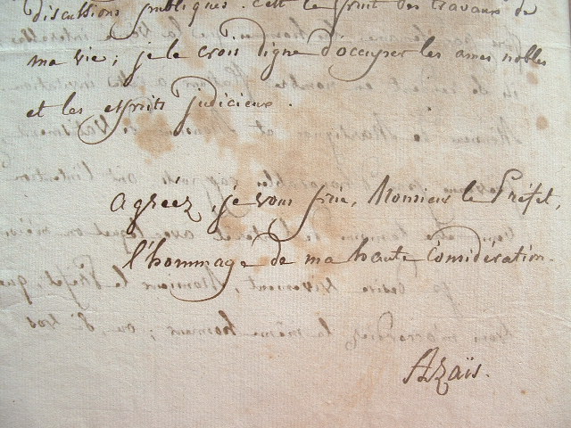 Pierre Hyacinthe Azaïs (Sorèze (Tarn), 1766/1845)«J'ai invité à se réunir dans mon jardin, trois fois par semaine, les hommes que la vérité intéresse ; ils se rendent en nombre flatteur à cette invitation. Monsieur de Martignac et monsieur de Vatismenil, prévenus par d'honorables rapports, ont l'intention de venir être témoins de l'intérêt avec lequel on m'écoute». Il désire vivement sa présence. «Je vous prie d'adresser à mon hermitage quelques personnes éclairées dont le jugement mérite votre confiance». Il lui adresse un exemplaire de l'ouvrage «que je développe dans mes discussions publiques. C'est le fruit des travaux de ma vie ; je le crois digne d'occuper les âmes nobles et les esprits judicieux».