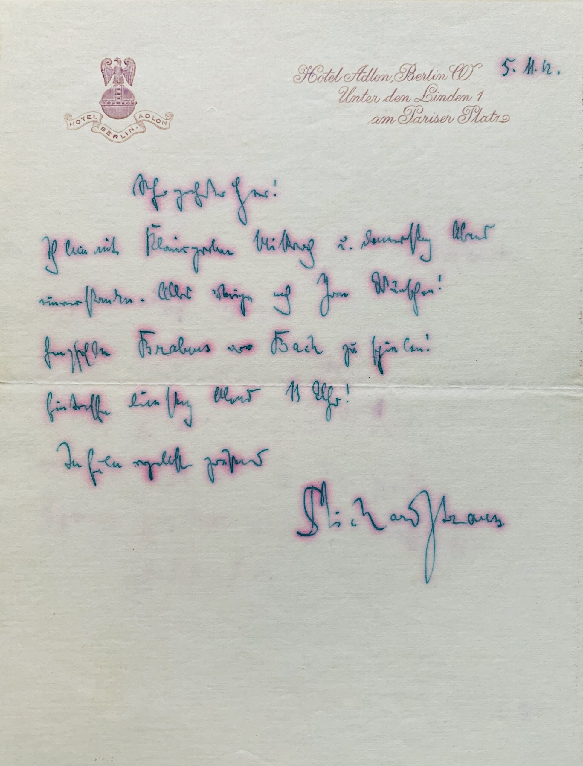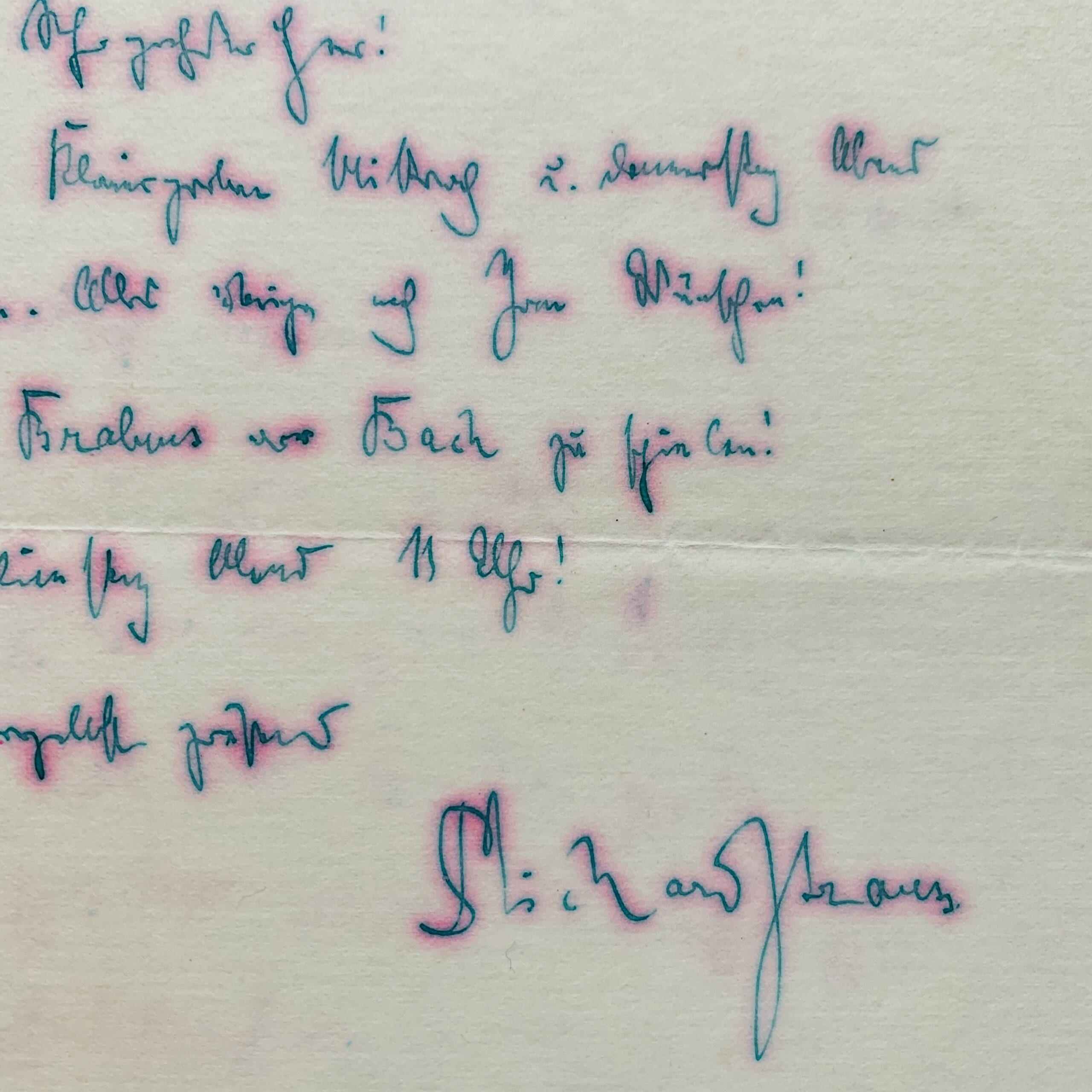 Ich bin mit Klavierproben Mittwoch und Donnerstag Abend einverstanden. Alles übrigens nach Ihren Wünschen. Empfehle Brahms oder Bach zu spielen. Ihre Frau ergebenst grüssend. Dr Richard Strauss"