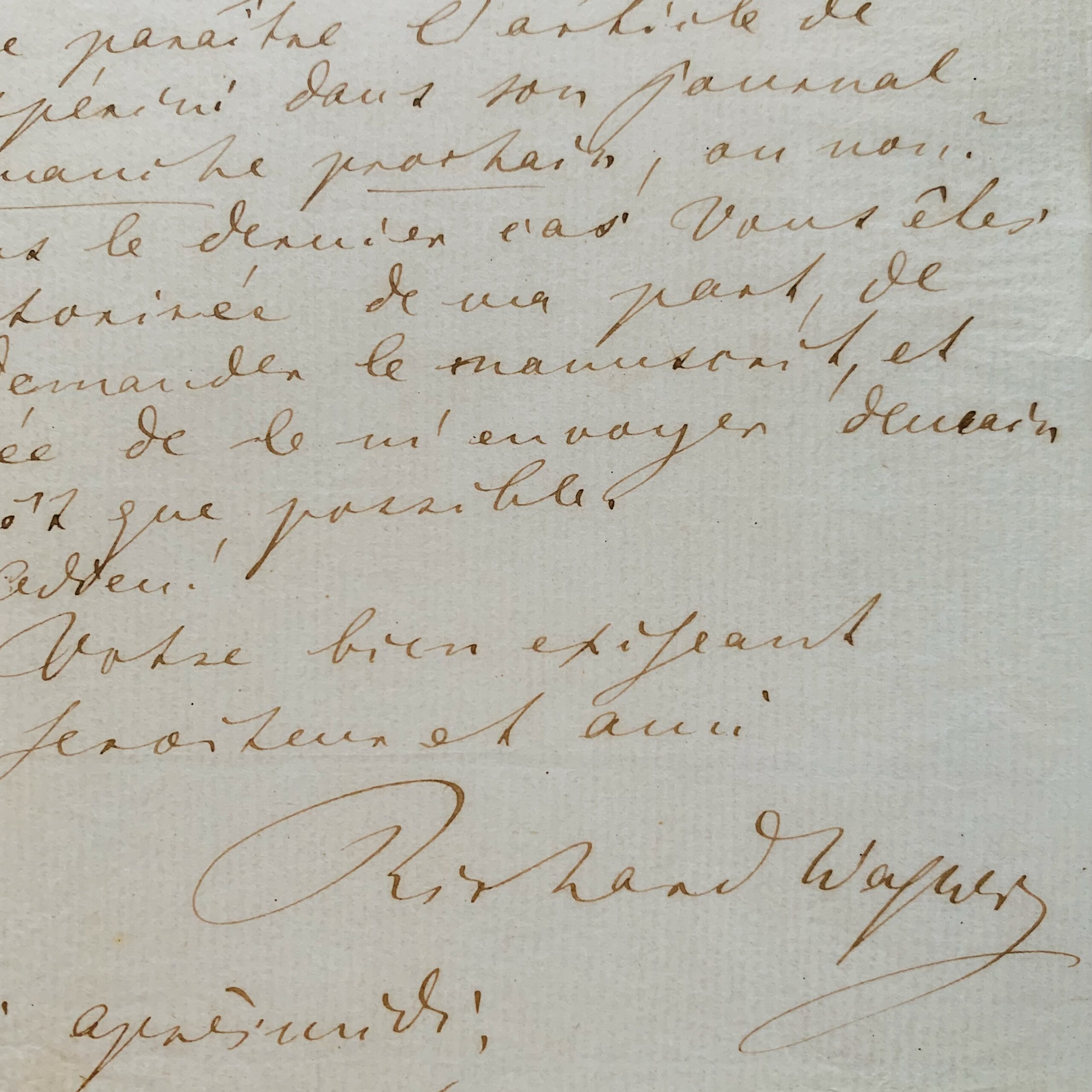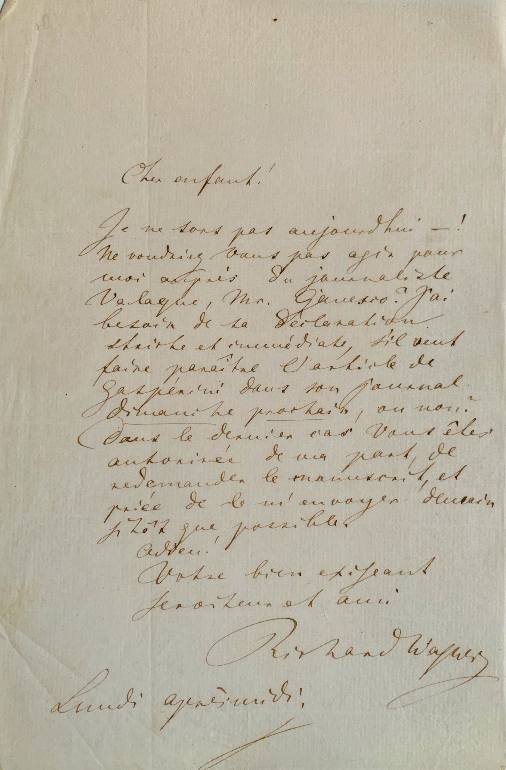 "Cher enfant! Je ne sors pas aujourd'hui! Ne voudriez-vous pas agir pour moi auprès du journaliste Valaque, Mr Ganesio? J'ai besoin de sa déclaration stricte et immédiate, s'il veut faire paraître l'article de Gaspérini dans son journal dimanche prochain, ou non. Dans le dernier cas, vous êtes autorisé de ma part, de redemander le manuscrit, et prié de me l'envoyer demain sitôt que possible. Adieu! Votre bien exigeant serviteur et ami. Richard Wagner".