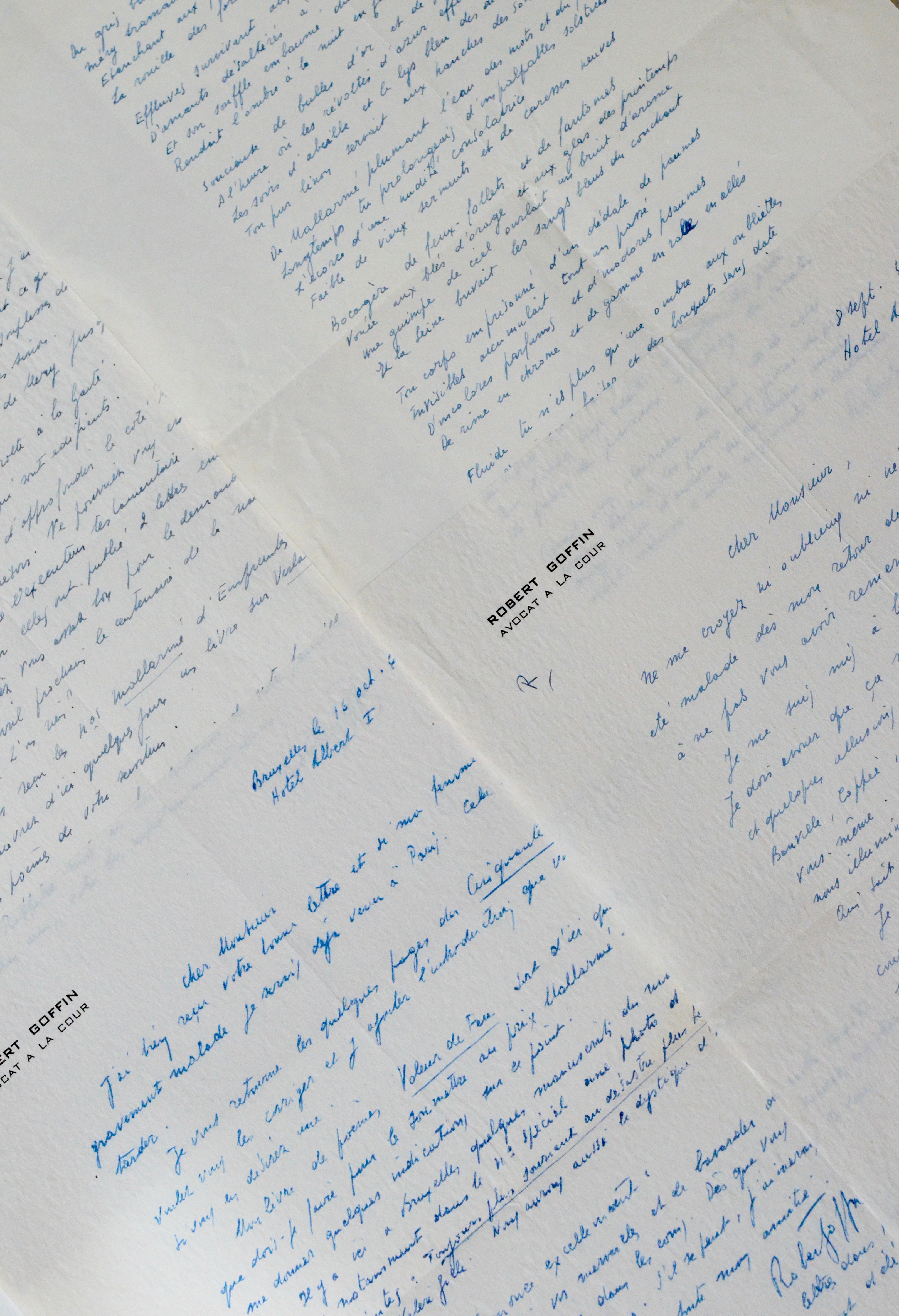 Robert Goffin (Ohain, 1898/1984)Ensemble de trois lettres et un poème manuscrit de Robert Goffin, adressés au poète et critique littéraire Henry Charpentier (1889-1952), secrétaire général puis directeur de l’Académie Mallarmé.
