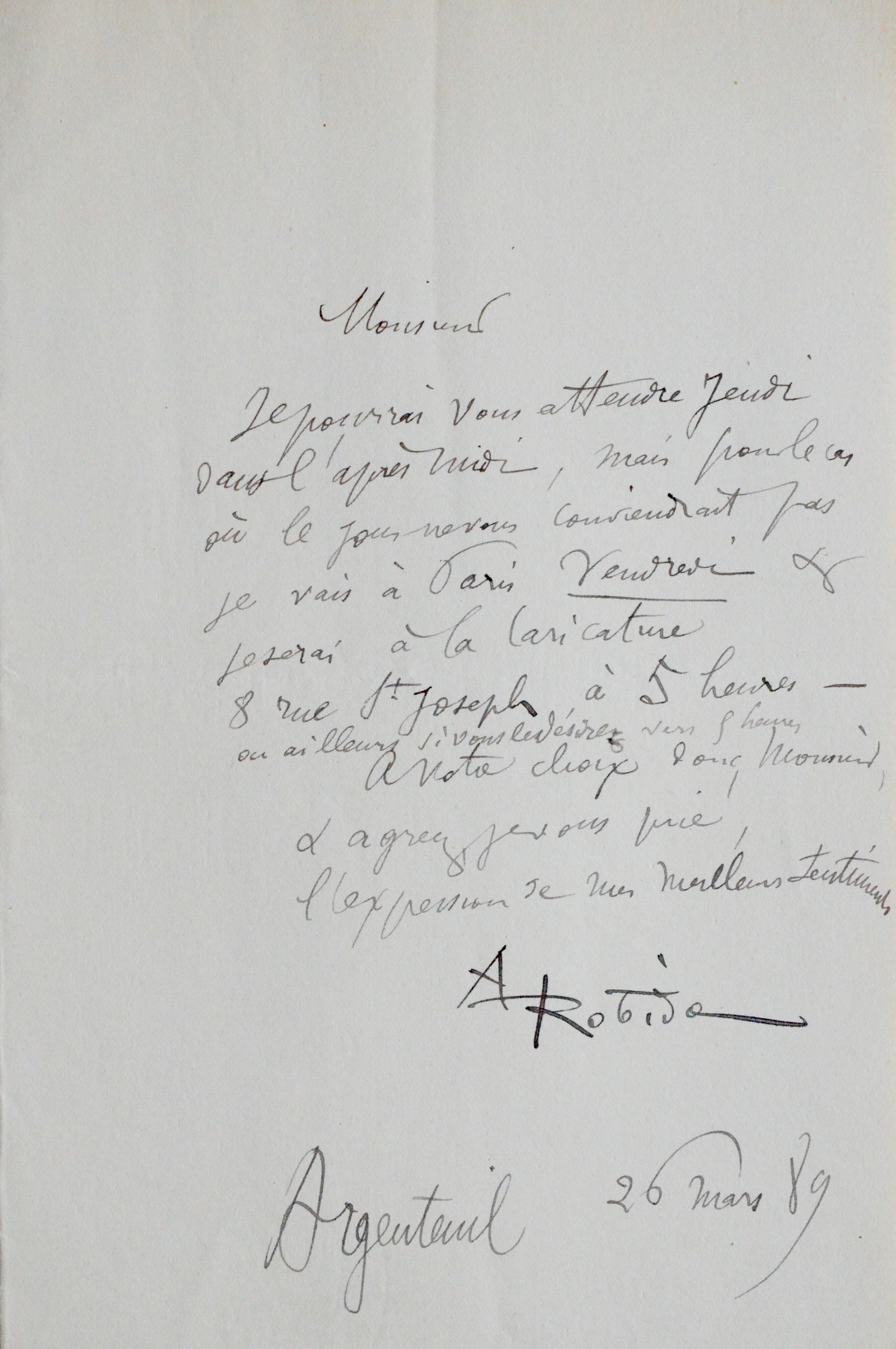 "Je pourrai vous attendre jeudi dans l'après midi, mais pour le cas ou le jour ne vous conviendrait pas je vais à Paris vendredi & je serai à la Caricature 8 rue St Joseph à 5 heures - ou ailleurs si vous le désirez [...]".