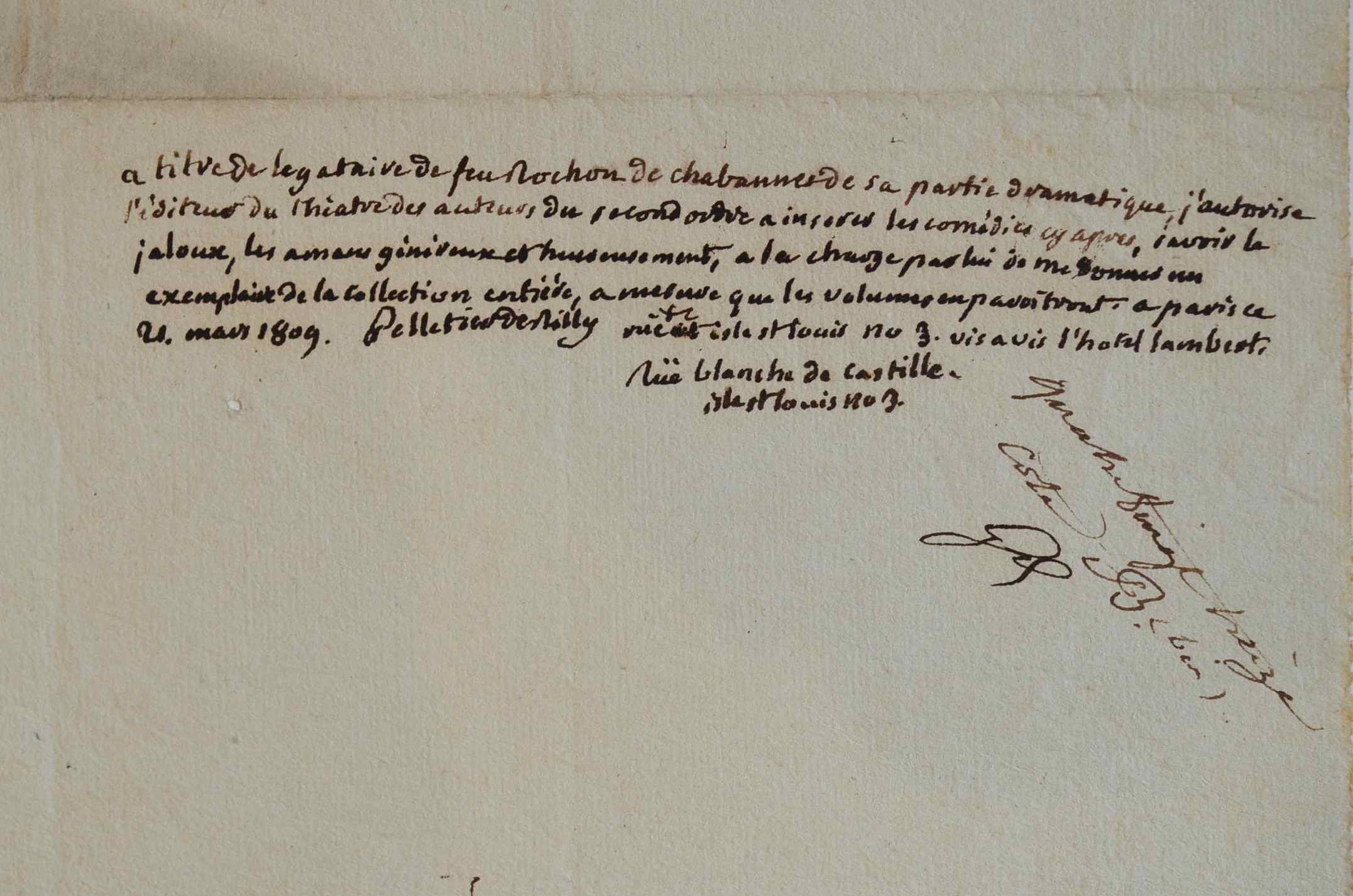 «A titre de légataire de feu Rochon de Chabannes de sa partie dramatique, j'autorise l'éditeur du Théâtre des auteurs du second ordre à insérer les comédies cy-après ; savoir Le Jaloux, Les Amans généraux et Heureusement, à la charge pour lui de me donner un exemplaire de la collection entière, à mesure que les volumes paraîtront.» Il s'agit du Répertoire général du Théâtre français, dont le tome (tome 50) consacré à Rochon de Chabannes, parut en 1813. Le document est rédigé et signé par Pelletier de Rilly. [Marc-Antoine-Jacques Rochon de Chabannes (1730-1800), chargé d'affaires de France à Dresde, est l'auteur de nombreuses pièces, la plupart données au Théâtre-français].