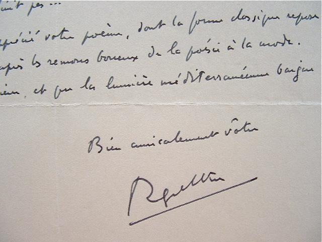 Roger Ikor (Paris, 1912/1986)Roger Ikor remercie son correspondant de son souvenir. «De temps à autre, je pensais à vous, surtout quand je contemplais l'autographe de Goncourt que vous avez eu la gentillesse de m'envoyer» [clin d'oeil au prix Goncourt, qu'il obtient en 1955]. Il évoque les poèmes de son correspondant et son combat contre les sectes [marqué par la mort de son fils qui s'est suicidé après avoir adhéré au Zen macrobiotique, il mène jusqu'à sa mort une lutte contre le phénomène sectaire, et fonde à cet effet le centre contre les manipulations mentales (CCMM)]. «Mais la vie que je mène en dépit de mes 73 ans est harassante. Ce combat contre les sectes n'en finit pas... J'ai beaucoup apprécié votre poème, dont la forme classique repose comme l'eau pure après les remous boueux de la poésie à la mode. Continuez, cher monsieur, et que la lumière méditerranéenne baigne votre inspiration».