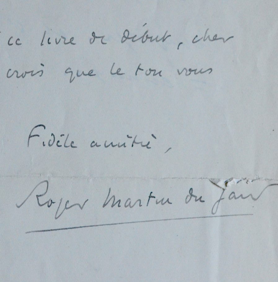 Roger Martin du Gard recommande vivement la lecture d'un ouvrage à son ami Marcel Jouhandeau : "Lisez ce livre de début, cher ami, je crois que le ton sous plaira. Fidèle amitié".