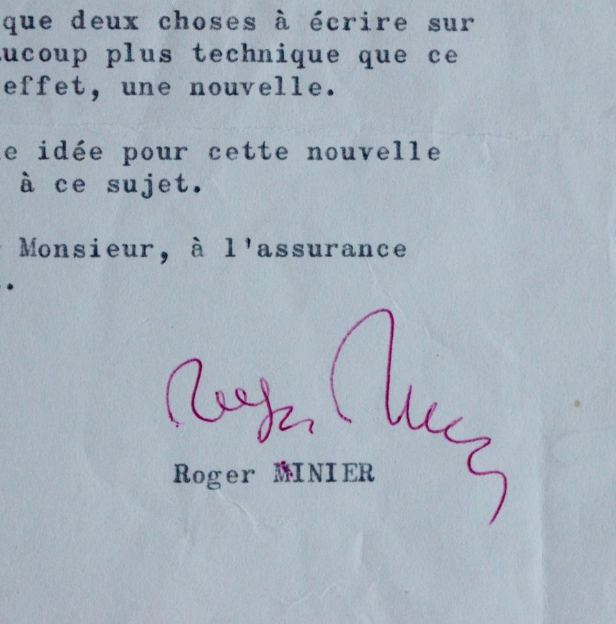 Roger Nimier remercie Dalinval pour ses articles "[...] Marcel Jouhandeau sera toujours admirable. A priori, je ne vois que deux choses à écrire sur l'Epargne : soit un article beaucoup plus technique que ce que je viens de lire, soit, en effet, une nouvelle. J'aurais peut-être une idée pour cette nouvelle et je puis donc vous téléphoner à ce sujet [...]".