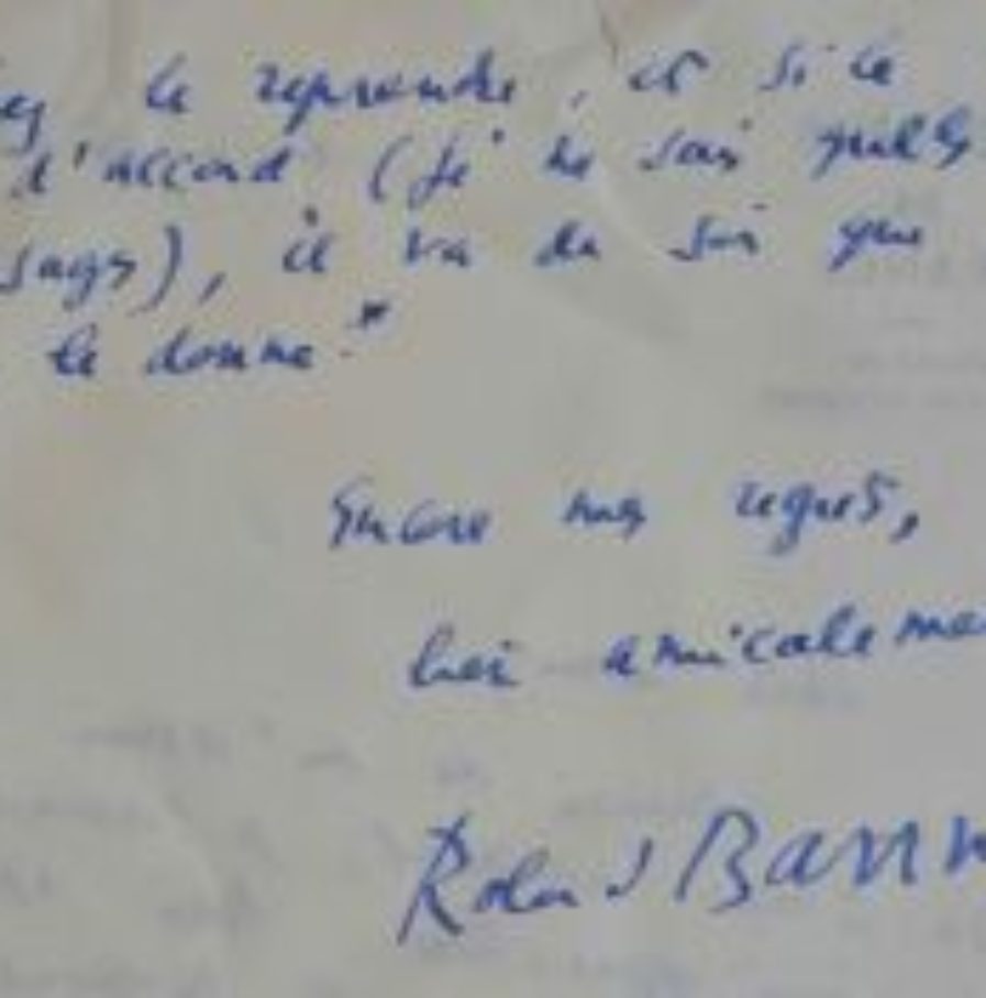 Roland Barthes explique les raisons du refus d'une collaboration. «En temps normal, j'aurais essayé de faire quelque chose. Mais là, après une année très dure, le moment est venu pour moi d' "entrer en loge" pour un travail personnel important : je ne veux répondre à aucune demande pendant quelques mois ; il faut me comprendre et ne pas m'en vouloir. J'ai fait il y a quelques semaines pour la page du Monde un texte court sur Voltaire et Rousseau ; ce texte a paru avec des coupures. Si vous désirez le reprendre, et si le Monde est d'accord (je ne sais quels sont les usages), il va de soi que je vous le donne [...]».