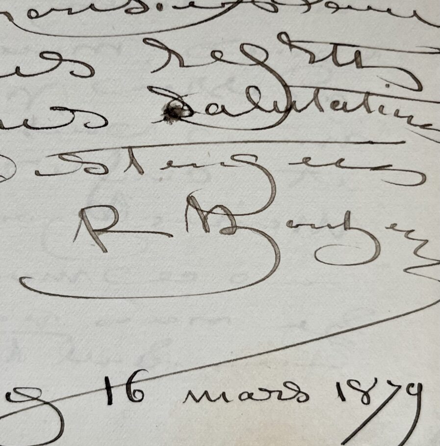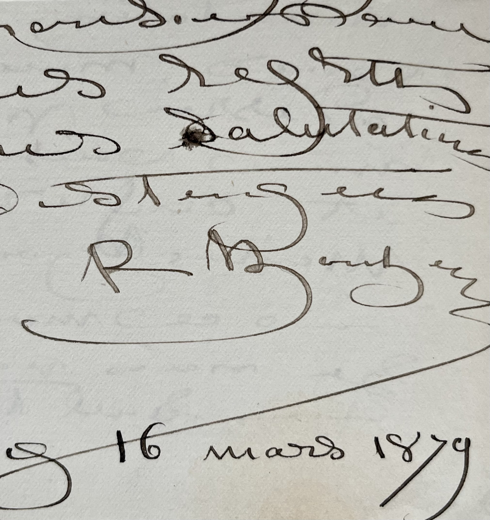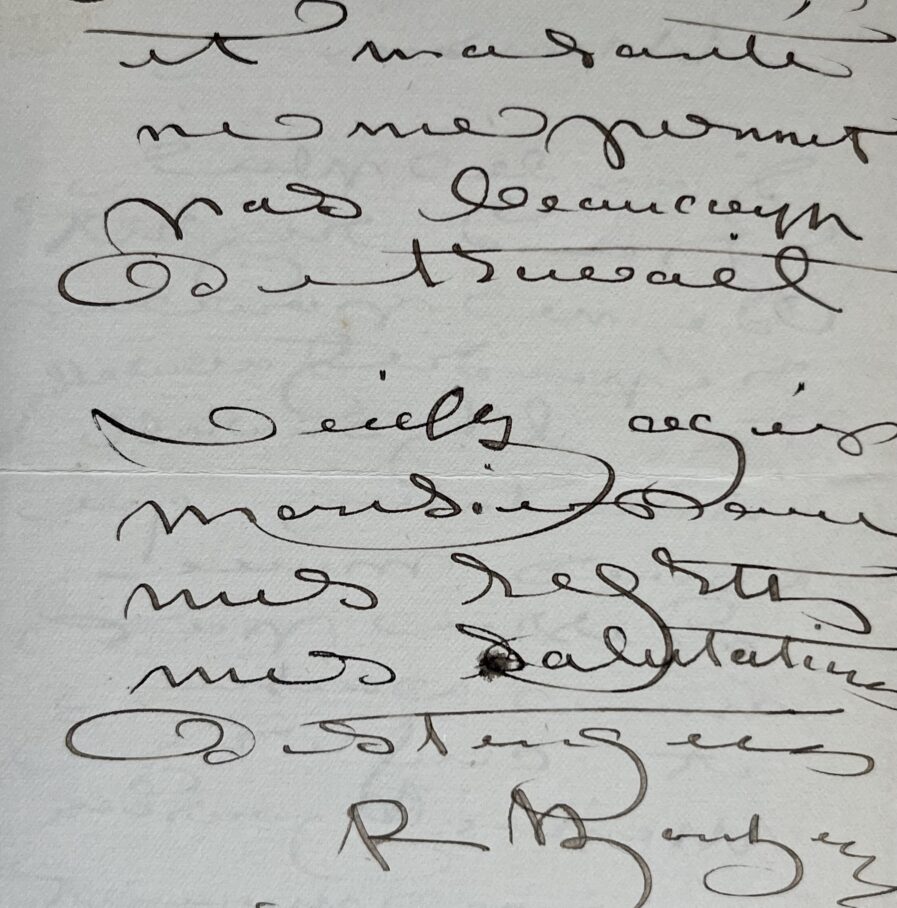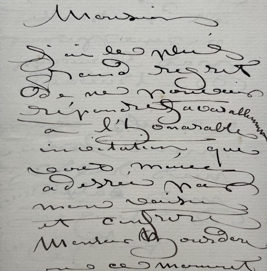 "Monsieur, j'ai le plus grand regret de ne pouvoir répondre favorablement à l'invitation que vous m'avez adressée par mon voisin et confrère Monsieur Bourdon. En ce moment je n'ai pas un seul tableau dont je puisse disposer et ma santé ne me permet pas beaucoup de travailler [...].