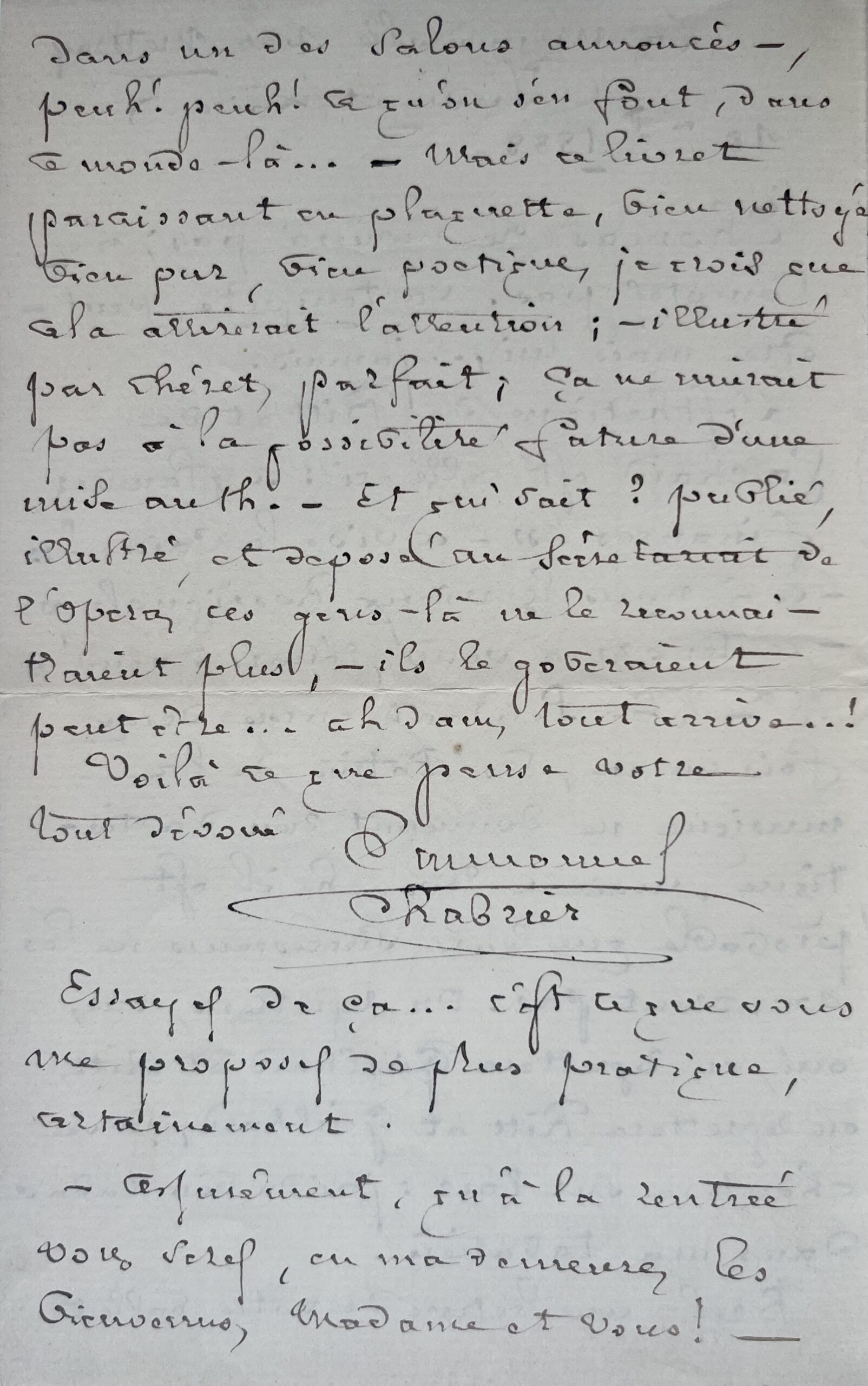 "Thomas ne mourra pas ; n’y compte pas. Sa tempête, peut-être, mais lui, jamais [ballet d'Ambroise Thomas : La Tempête, d’après Shakespeare]. L’esthétisme de Ritt et de Gailhard [Eugène Ritt directeur de l'Opéra et son directeur de la scène Pedro Gailhard] est celle-ci : « plomber, finances ! »–« vive la caisse ! »–« à nous les vieux Rossignols » - [...]. Pendant encore deux fois un an, ces potins de la musique ne donneront rien d'artistique, mais en revanche, il est probable que leurs successeurs ne les attendront pas. On regrettera, oui, oui, on regrettera, Gailhard et Ritt, on regrettera Ritt et Gailhard ; ça se chantera sur l’air : j’ai du bon tabac dans ma tabatière ! Bref, une lecture de votre ballet, dans un des salons annoncés -, peuh ! peuh ! Ce qu’on s’en fout, dans ce monde là… - Mais, ce livret paraissant en plaquette, bien nettoyé, bien pur, bien poétique, je crois que cela attirerait l’attention ; -illustré, par Chéret, parfait [...]".