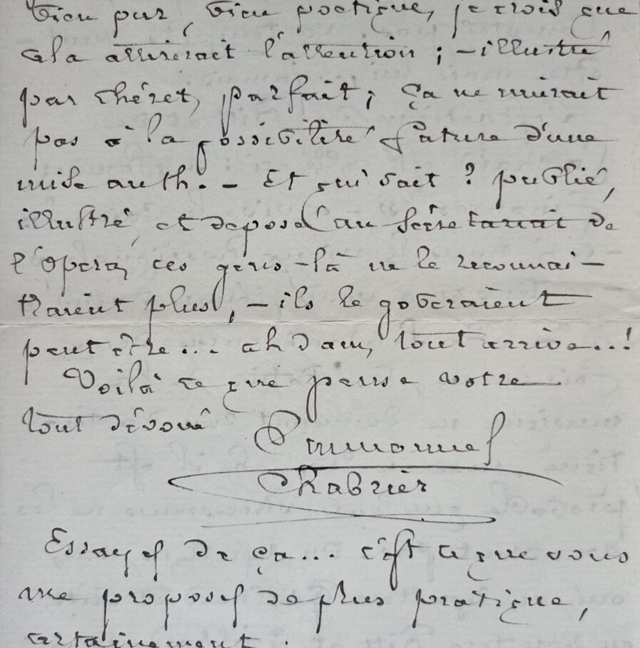 Sacarstique lettre d’Emmanuel Chabrier sur Eugène Ritt et Pedro Gailhard