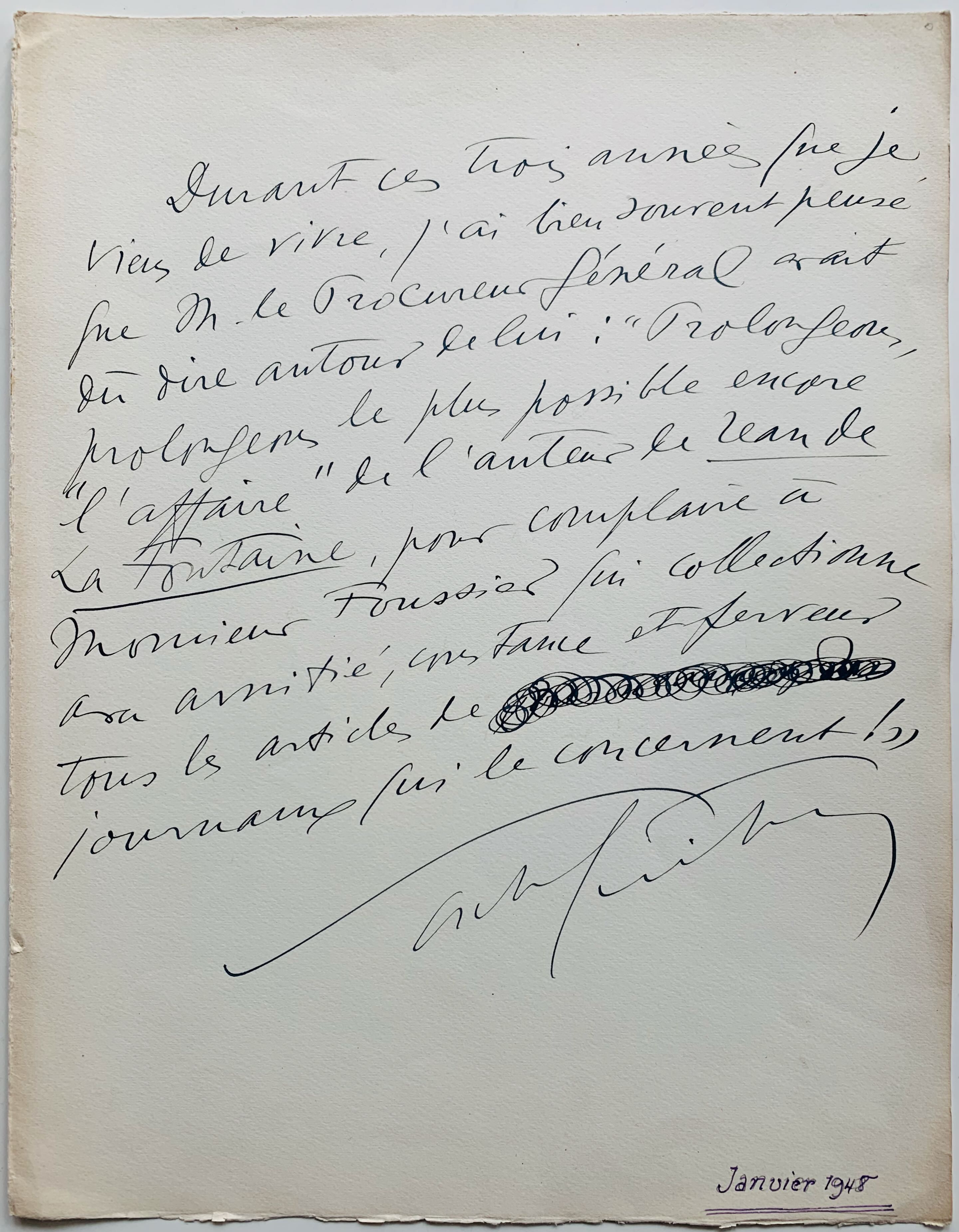 Sacha Guitry (Saint-Pétersbourg, 1885/1957)A la libération, Sacha est arrêté par un groupe de résistants agissant de leur propre initiative, et jeté en prison durant 60 jours. Le procureur, ne trouvant aucune pièce à charge, en dépit de ses appels publics pour en trouver, finit par classer le dossier ; trois ans plus tard, en 1947, un non-lieu est prononcé [Guitry dira plus tard qu'il aurait préféré un procès]. Dans ce texte, écrit sur un grand feuillet vergé, Guitry, qui vient tout juste d'obtenir son non-lieu, tourne en dérision les atermoiements du procureur général.